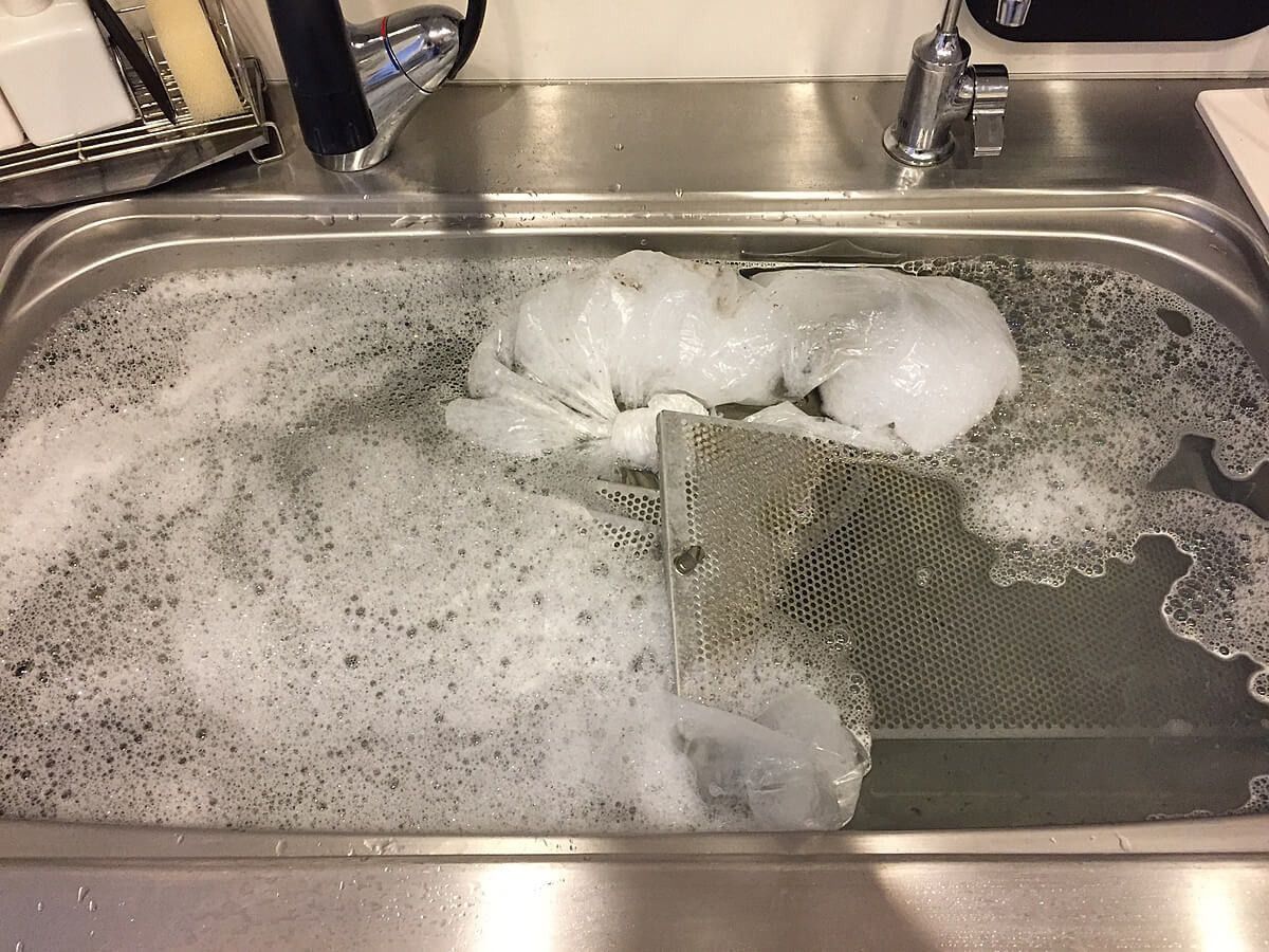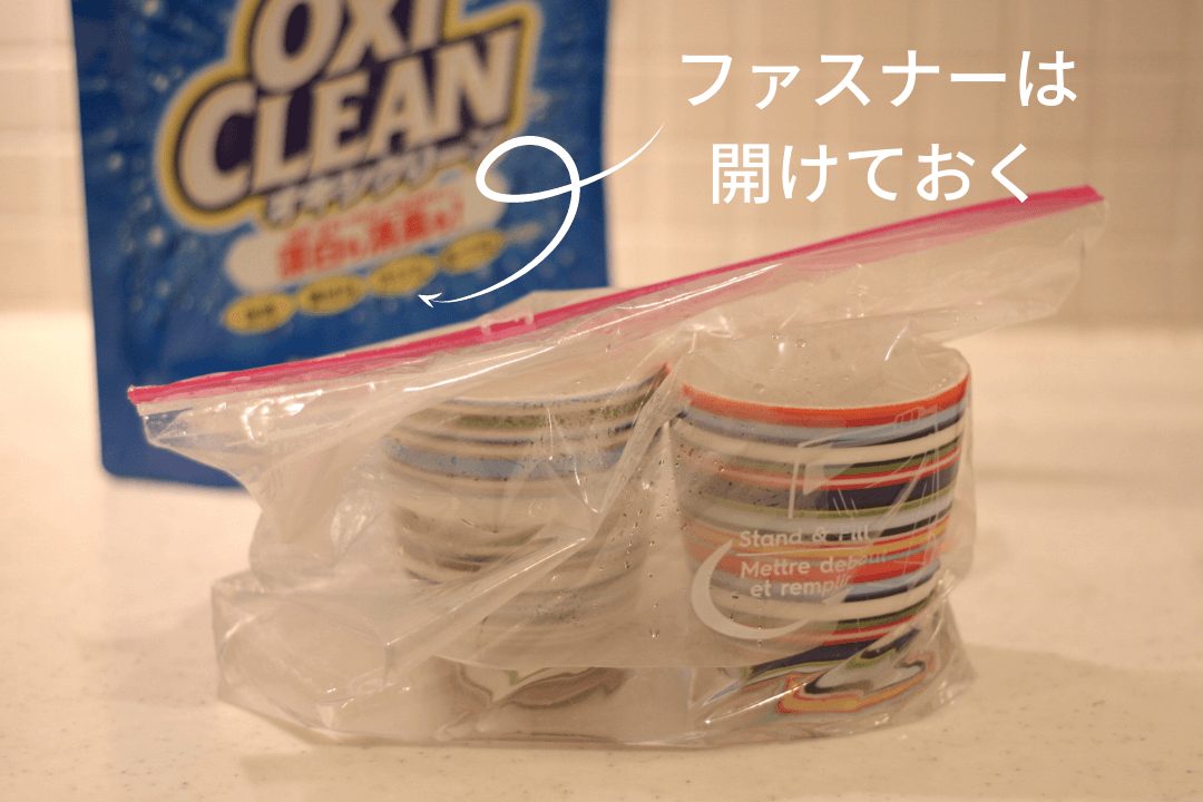 オキシクリーンは酸素を出し続けけていますので、くれぐれもジップロック®︎のファスナーは閉め切らないようにご注意ください。また隙間から水漏れする可能性もありますので、シンクや洗面器など、水漏れしても良い場所で試してみてくださいね。