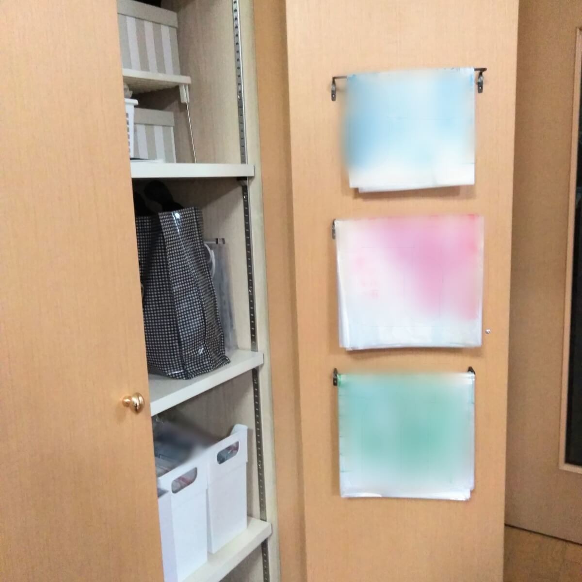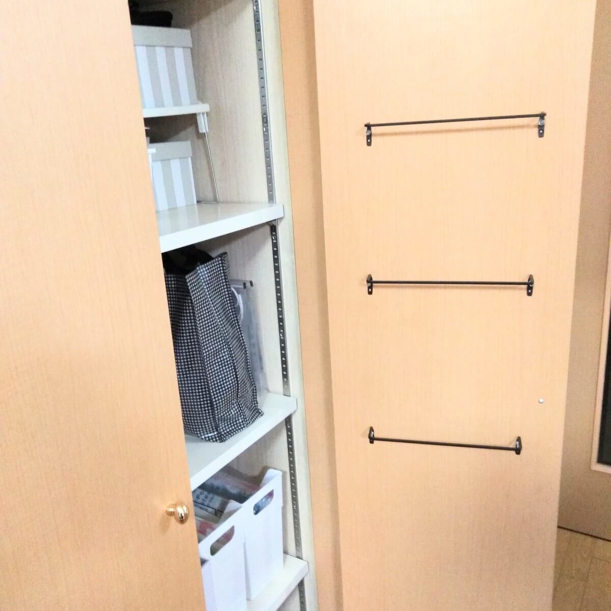 パントリーの扉の裏に、ダイソーの「スリムな針のプッシュピン」を使って設置しました。