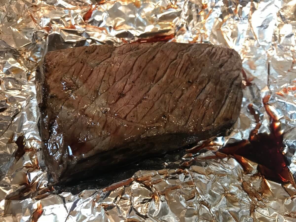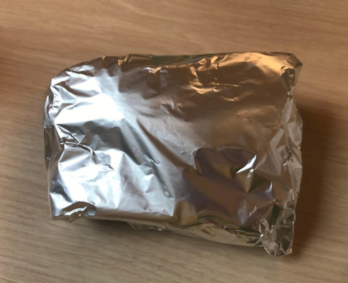 アルミホイルに、焼き終わったお肉をのせて、2重に包みましょう。