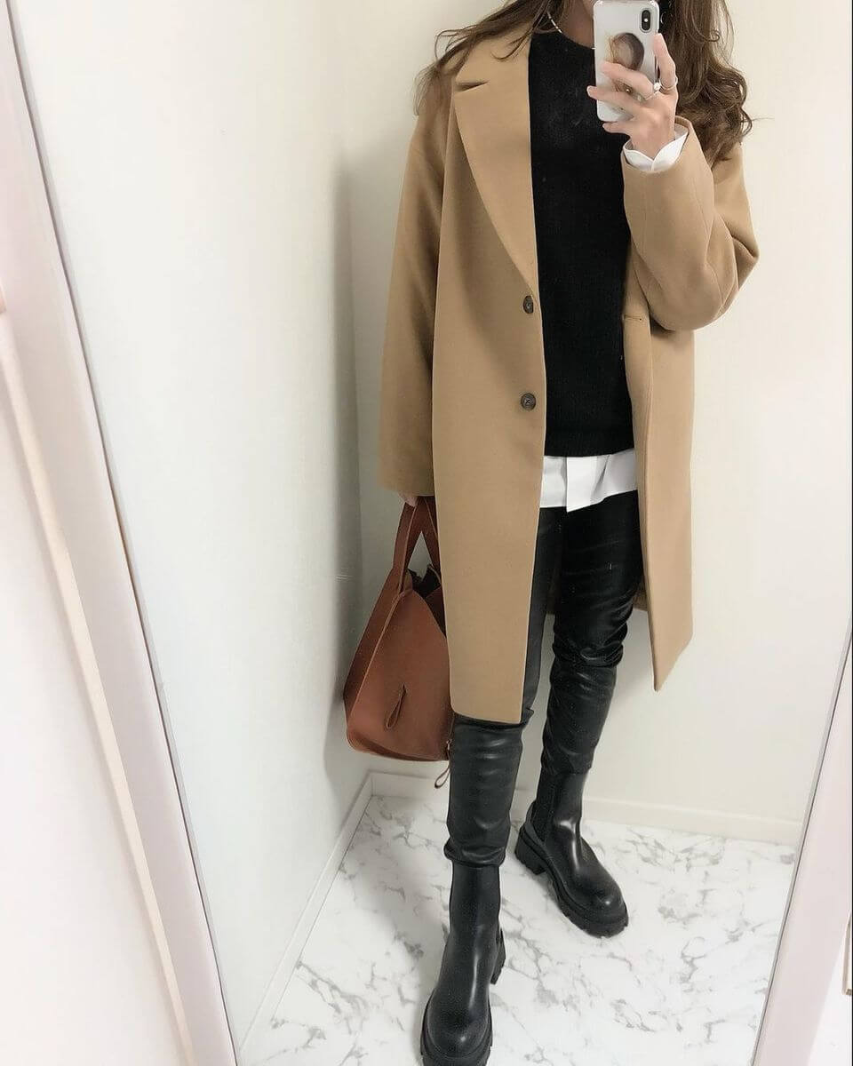 コートより長い丈のスカートやワンピースの女らしい着こなしと合わせて、ギャップを楽しんでみてください。