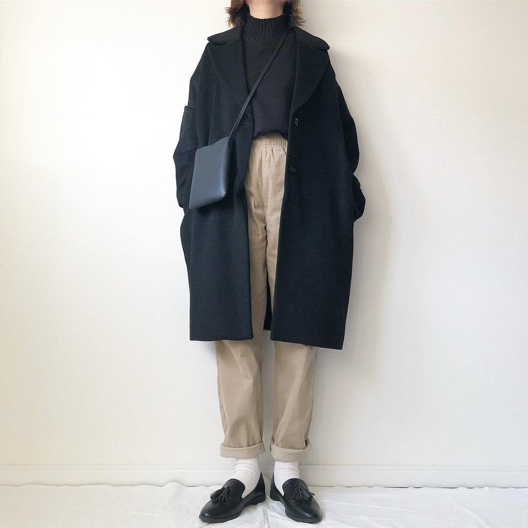 コートのオーバーサイズを活かすため、タイトにまとめるのがコツです♪