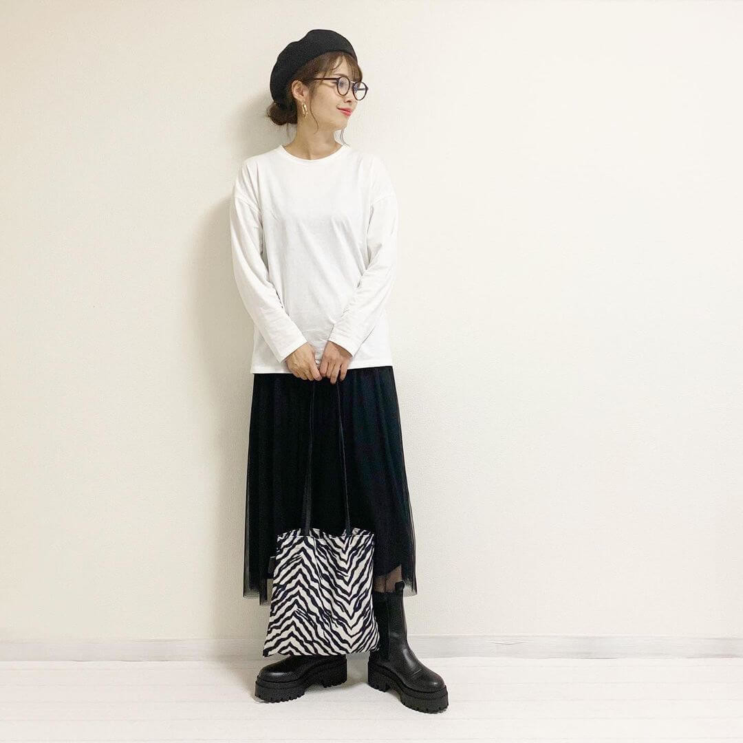 黒のチュールスカートに白トップスをコーディネートした、ガーリールックなスタイリング。