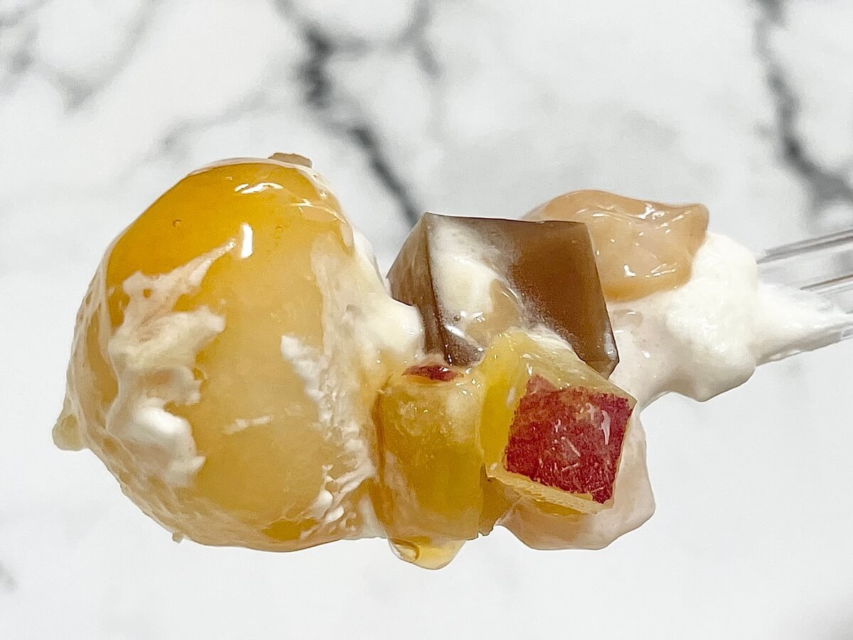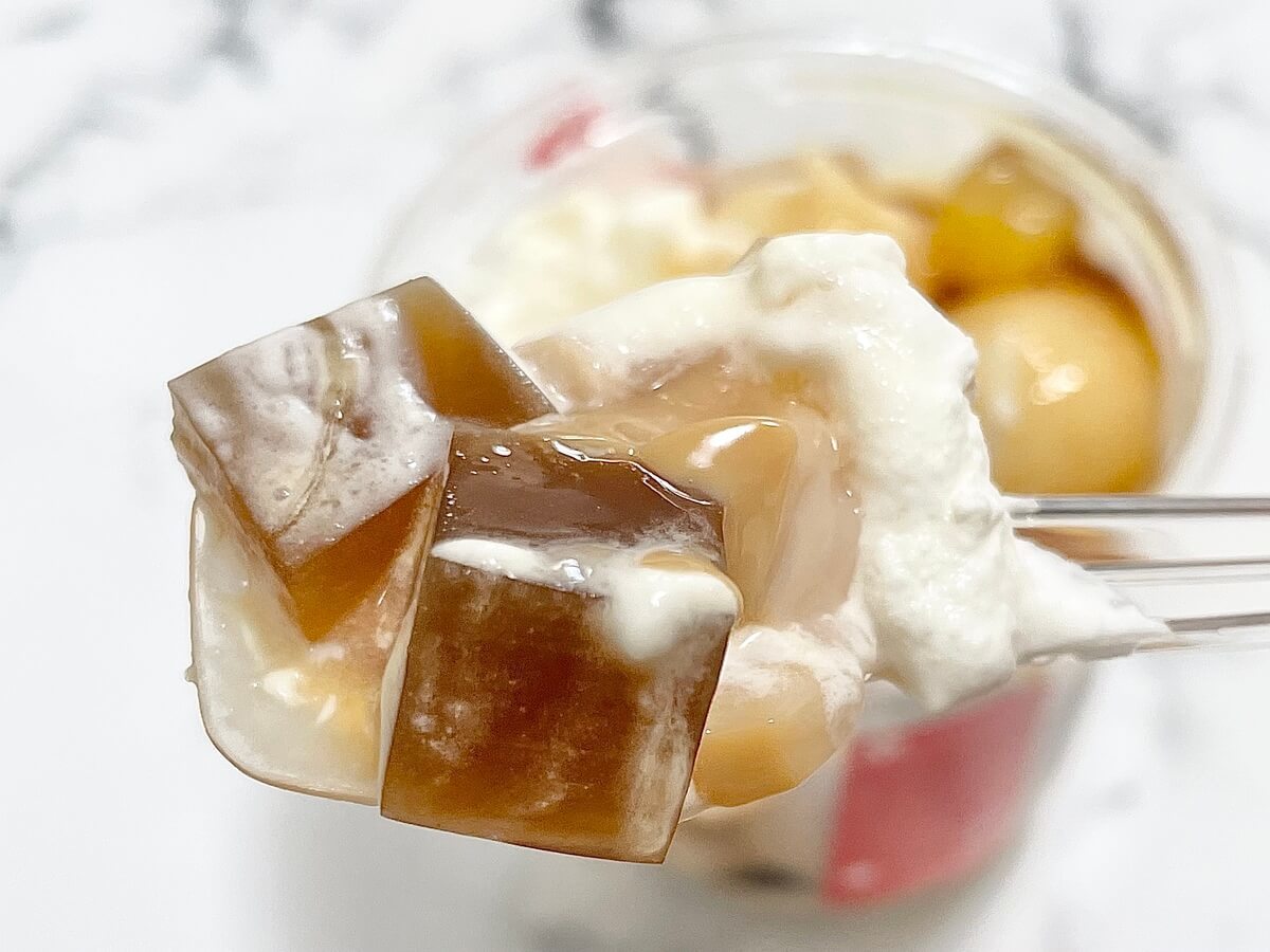ほうじ茶ミルクプリンに一気にフォークをさすと、角切りのゼリーと一緒に出てきました。