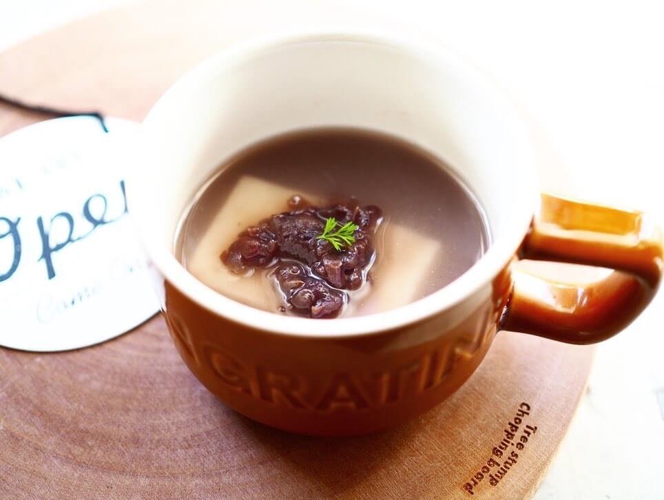 耐熱容器に粒あん・水を入れて電子レンジ500Wで1分10秒前後温めると、お手軽おしるこが完成♪