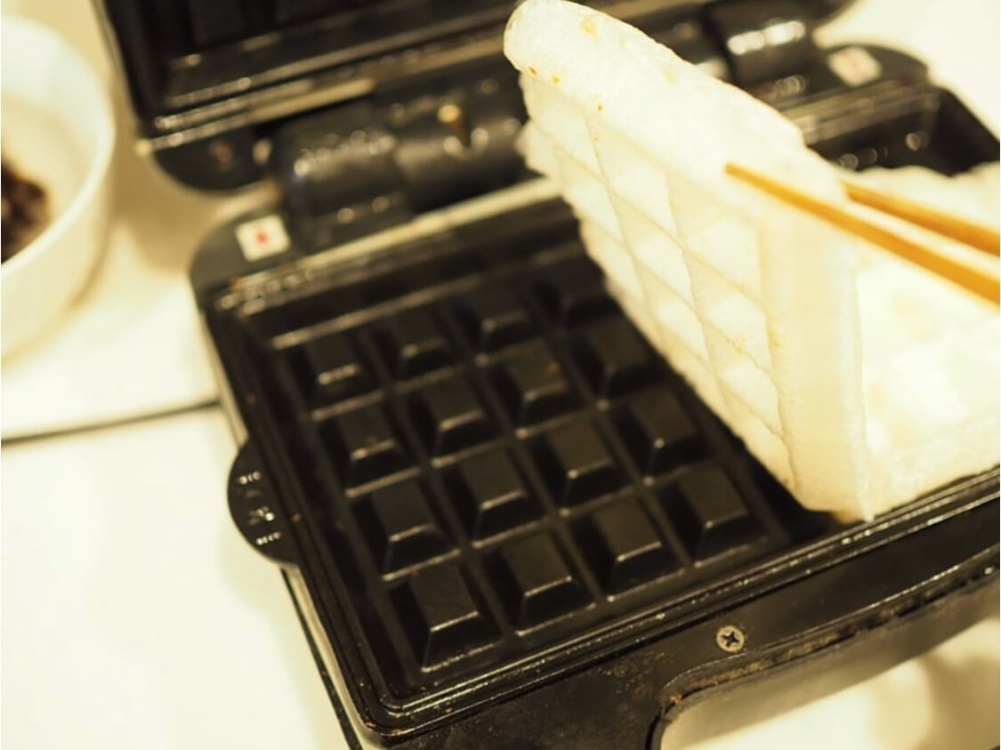 おうちにワッフルメーカーがある方は、お餅をワッフルメーカーで温めるとワッフル型の「モッフル」を作ることができます。