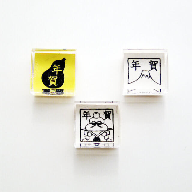 印面サイズは2㎝正方形なので、年賀状のデザインの一部として使うのも◎。ひょうたん、鏡餅、富士山の3種類から選べて、プチプラなのも嬉しいですね。