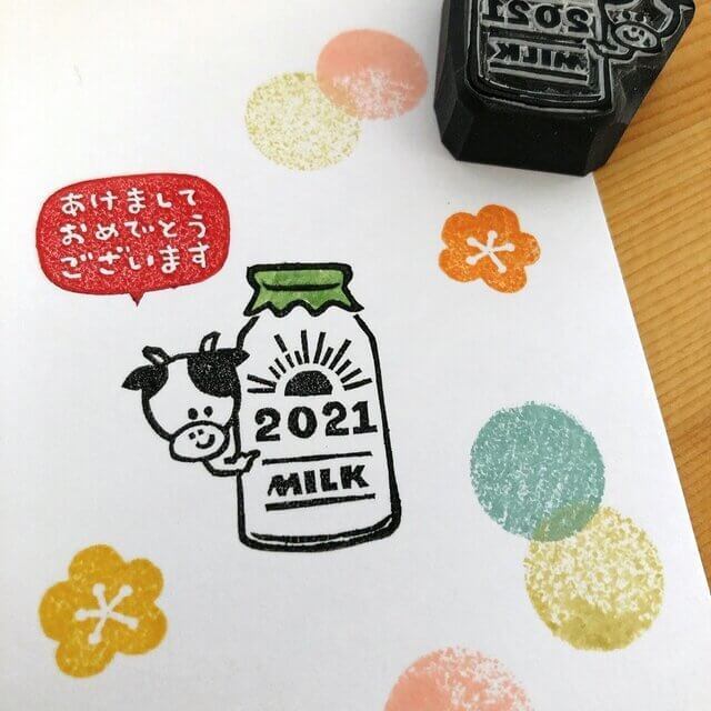ちょっぴり可愛い年賀状にしたいなら、ミルク瓶からひょっこり顔を出した「ウシ君ハンコ」がおすすめ。2021年の文字も入ったハンコなので、真ん中に押してメインにしても可愛いですよ!