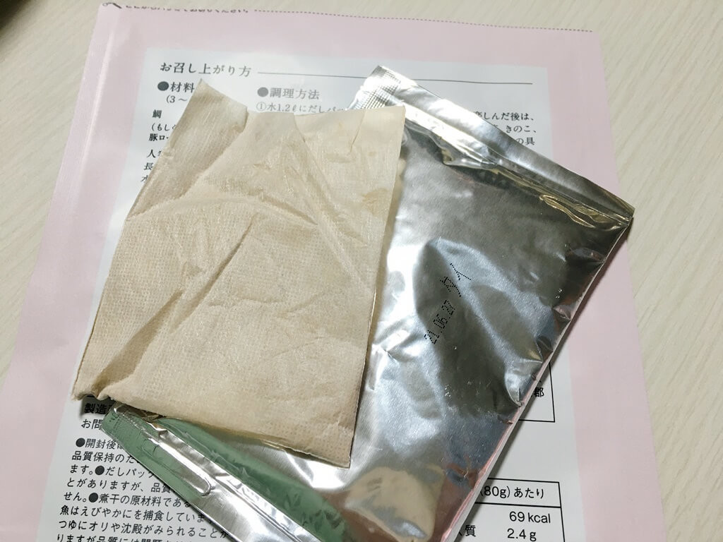 パッケージによると、昆布の他に宗田鰹節・鰹節・サバ節・いわし煮干し・あご煮干しと、これでもかというほどの魚のだしが詰め込まれています。