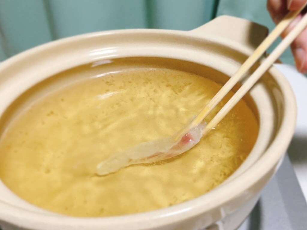 鍋つゆを入れると、さっぱりと爽やかな香りが広がります。ジンジャーエキスの香りでしょうか?しゃぶしゃぶで少し膨れたお腹でも、この香りのおかげで食欲がそそられるんです。