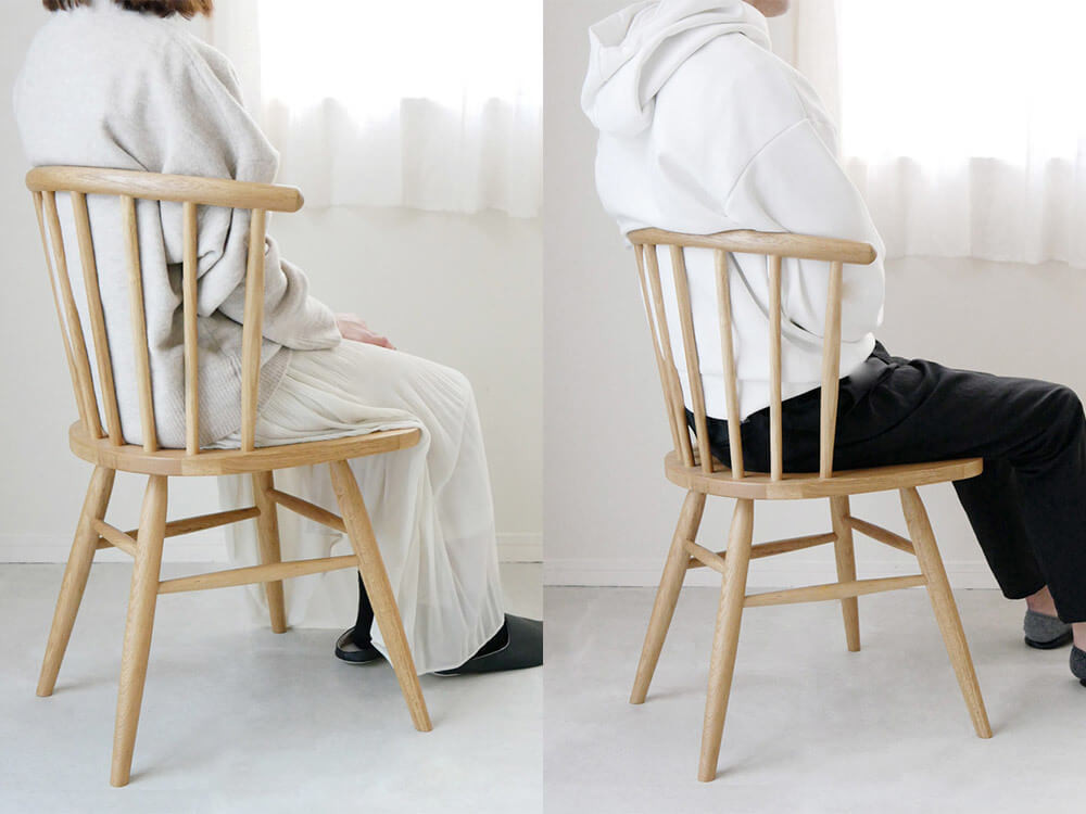 「ハーフラウンドチェア」は、素材や質感の他に座り心地も落ち着く仕上がりになっています。 笠木(背もたれ)は丸く柔らかく仕上げられていますが、背中に当たる部分だけ丸くなく、背中にフィットするよう削られています。また、座面にもなめらかな彫り込みがあり、両足を椅子から落としやすくする工夫もなされているんです。