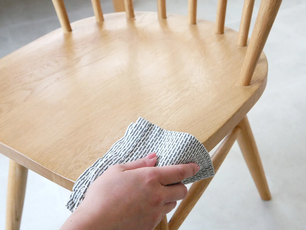 素材本来を楽しめるオイル仕上げは、コップの輪ジミなど長時間にわたり水分を放置しておくと、シミの原因となります。そのような輪ジミ、細かなキズなどはサンドペーパーできれいにし、オイルを塗ります。すると程よく目立たなくなります。