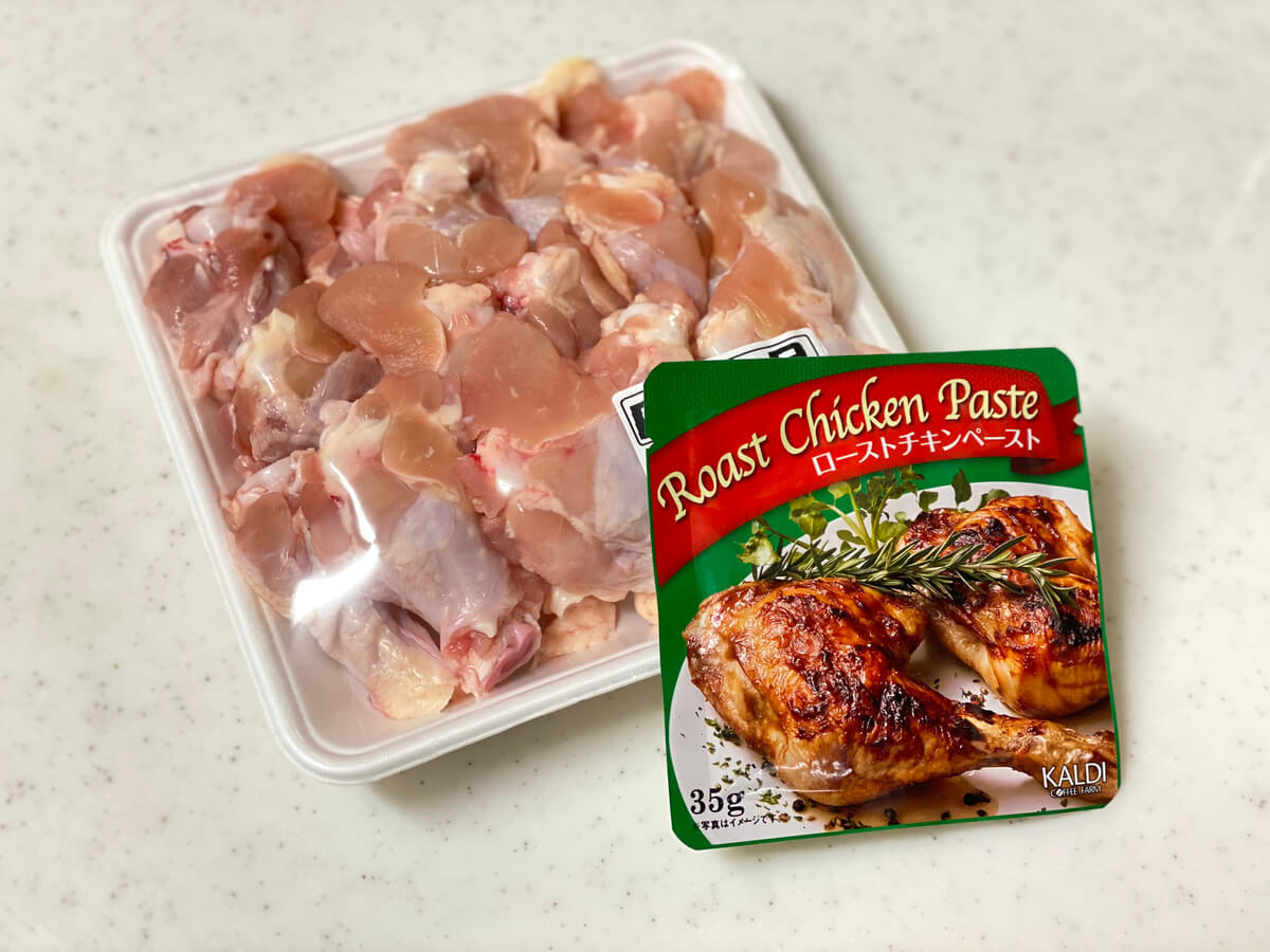 とはいえ超ズボラなので、こんな時に頼りになる「KALDI」の便利食材を使って手間をかけずに作りました! まるまるのローストチキンやケンタを買うより、ぐんと節約にもなります。