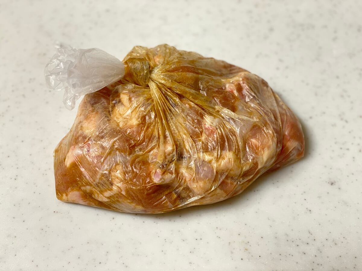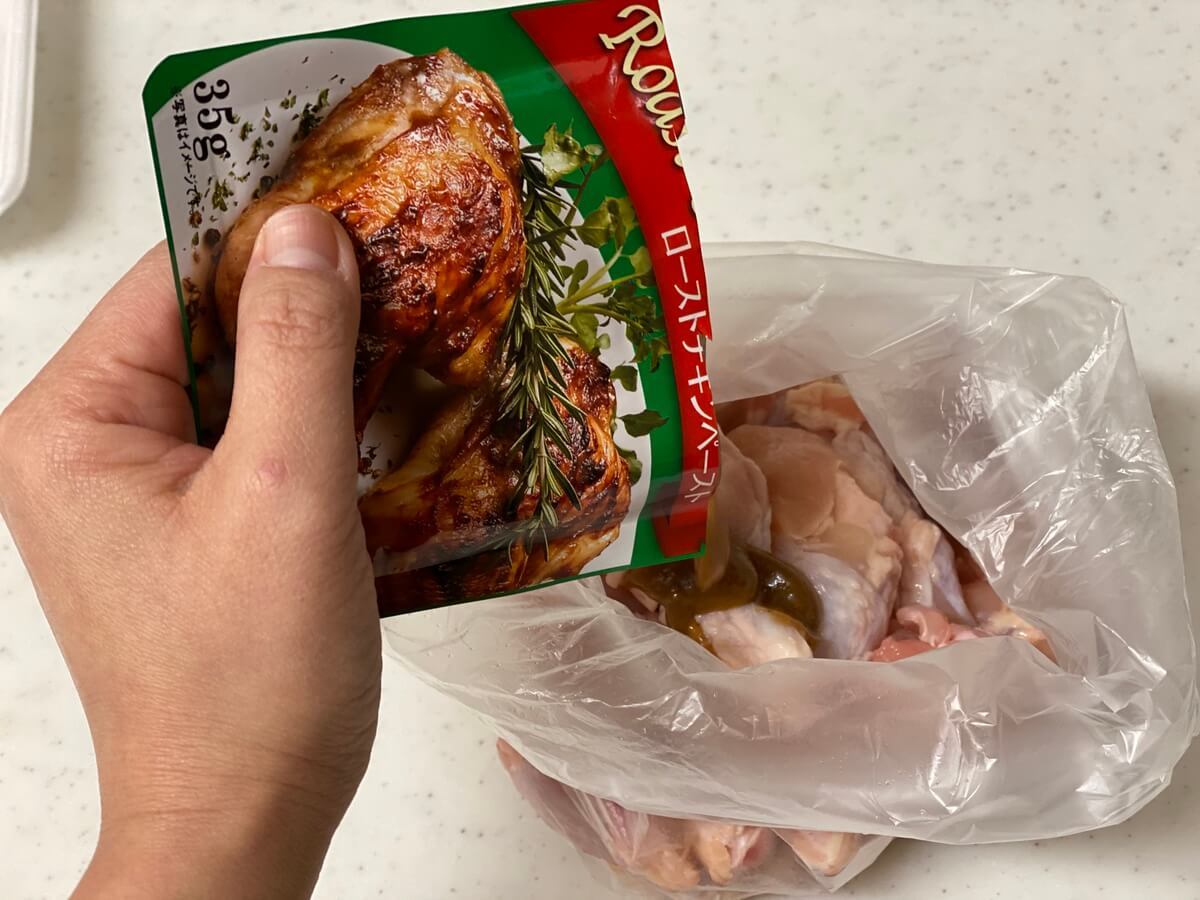 ポリ袋に手羽元(10~15本ほど)と「ローストチキンペースト」を入れて、袋の上から揉み込みます。