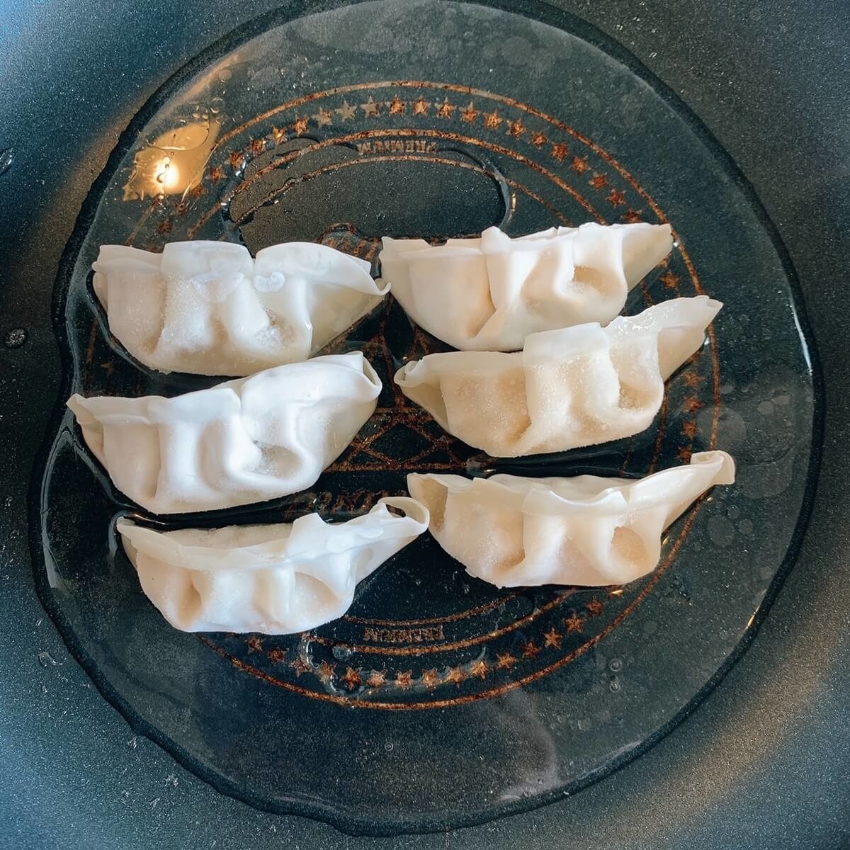まずはいつも通りの工程でフライパンを使い、餃子を焼いていきます。