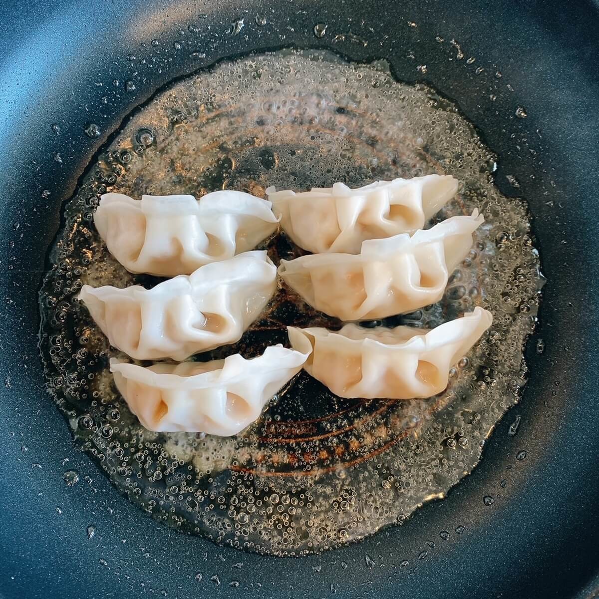 フライパンに油を熱し、餃子を入れて中火で焼きます。餃子が1/4浸る程度の水を入れ、蓋をして蒸し焼きにします。