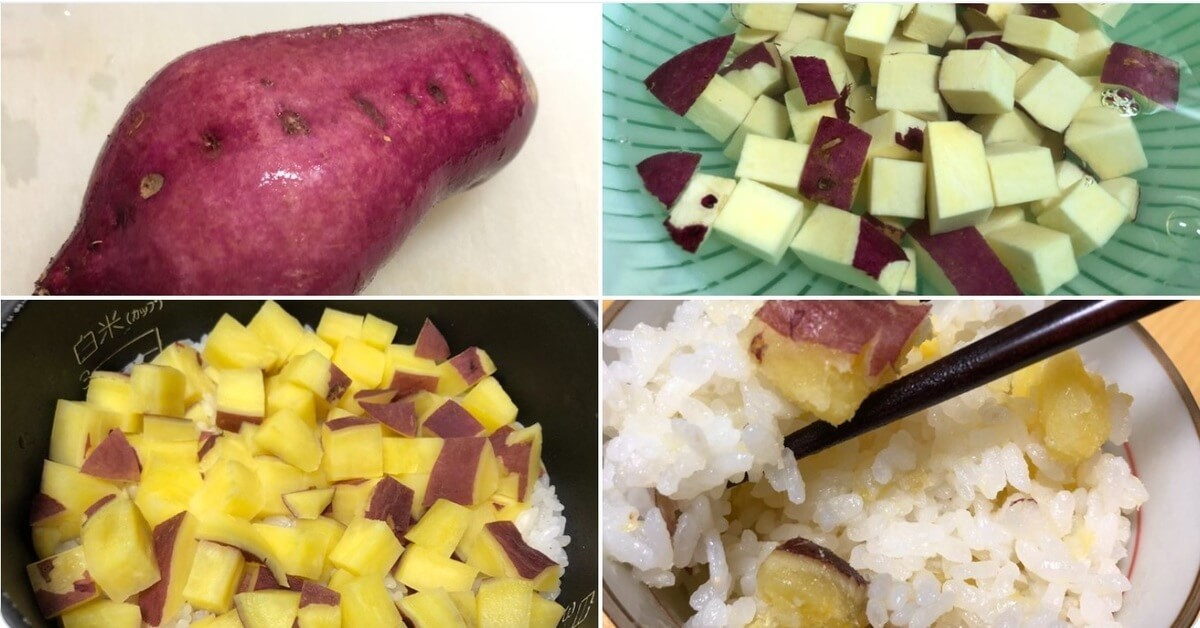 『さつまいも1本を2~3センチ角くらいにカットし、10分水にさらします。30分間水に浸したお米2合に塩少々を加えて混ぜ、カットしたさつまいもをのせて炊飯したらできあがり。食べたらほくほく甘いし、作るの簡単だし、良いことしかない』
