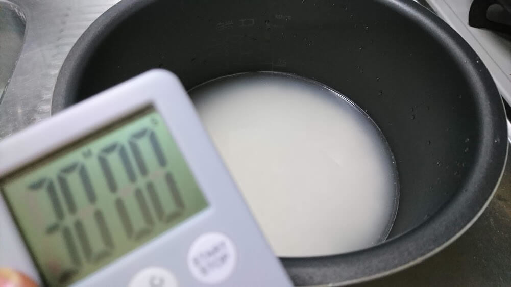 米2合を洗い、炊飯器の2合の線まで水を入れてそのまま30分間浸漬(しんし)します(※米を水に浸すこと)。しっかり浸漬させることでふっくら炊き上がります。