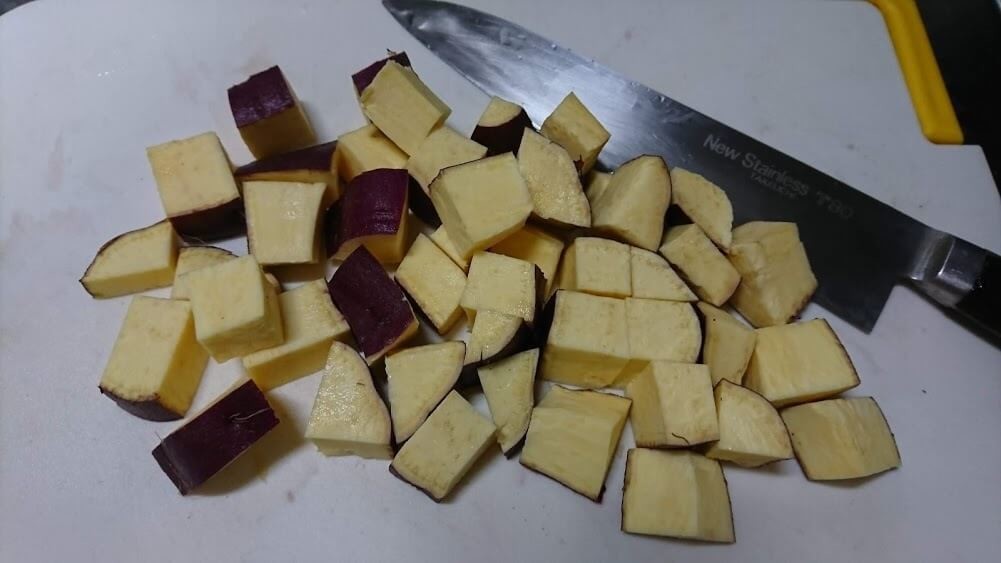 さつまいもを2~3cm角に切ります。ご飯となじみやすくするなら「2cm角」、さつまいもの食べ応えを重視するなら「3cm角」がおすすめです。我が家は1歳の子どもも食べるので2cm角にしました。