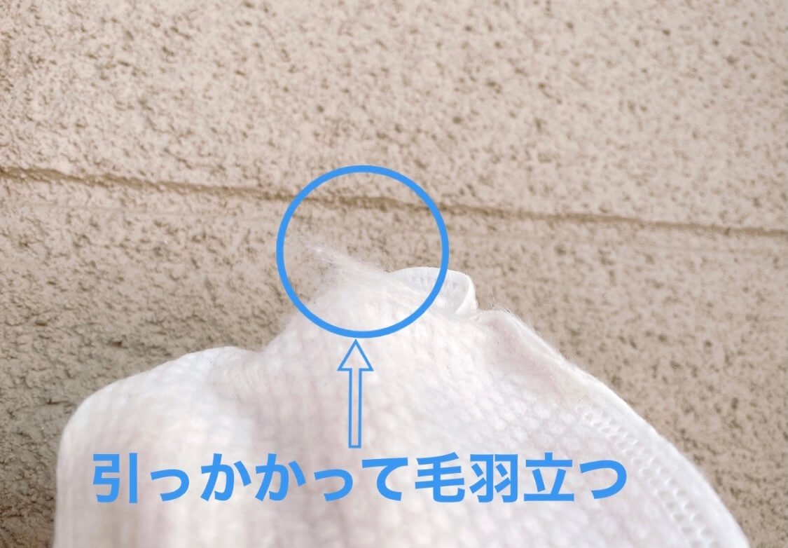 凸凹面やカーペットには使用不可ですが、敢えて凸凹面をゴシゴシ拭いてみました。やはり、画像のように引っかかって毛羽立ってしまいました。