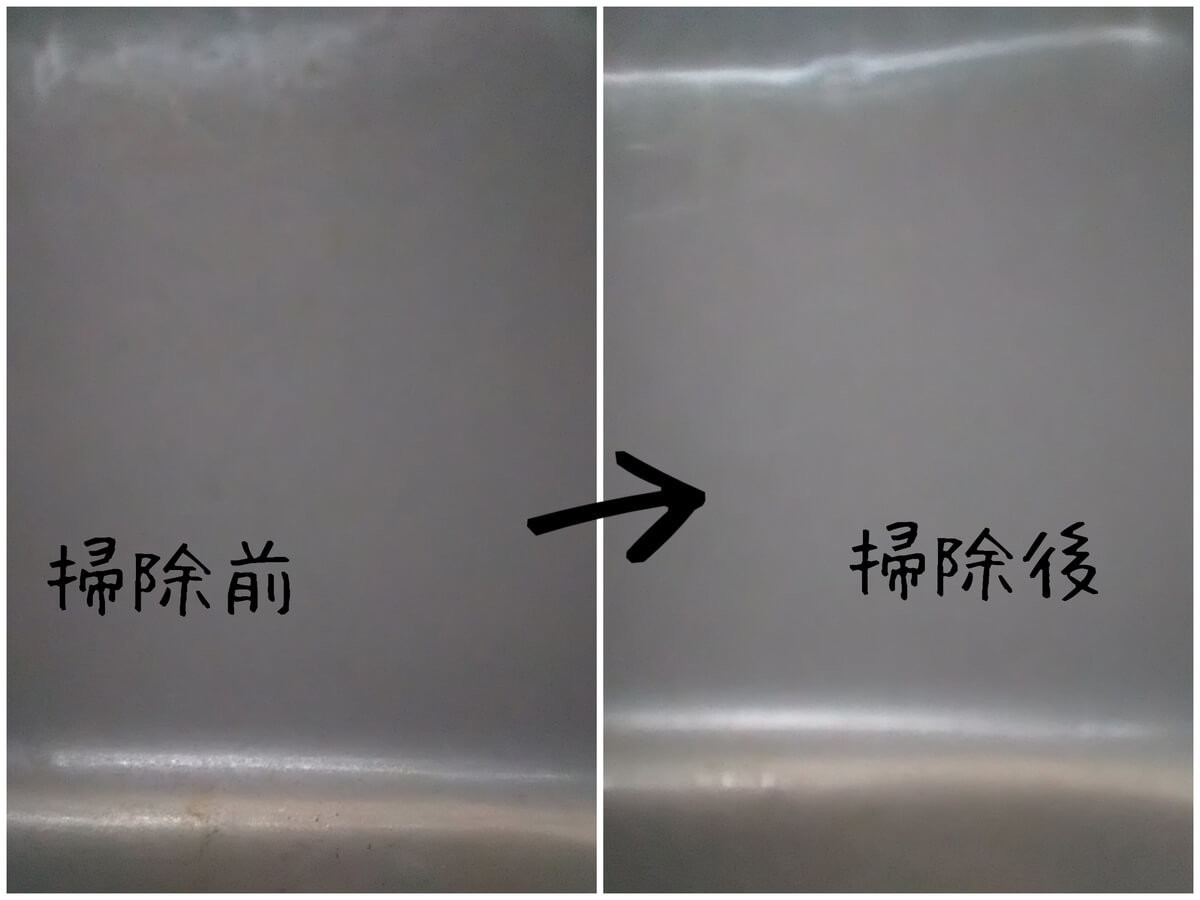 水に濡らして軽くこすると、ギトギト汚れがすっきり除去!ピカーッと反射しています。