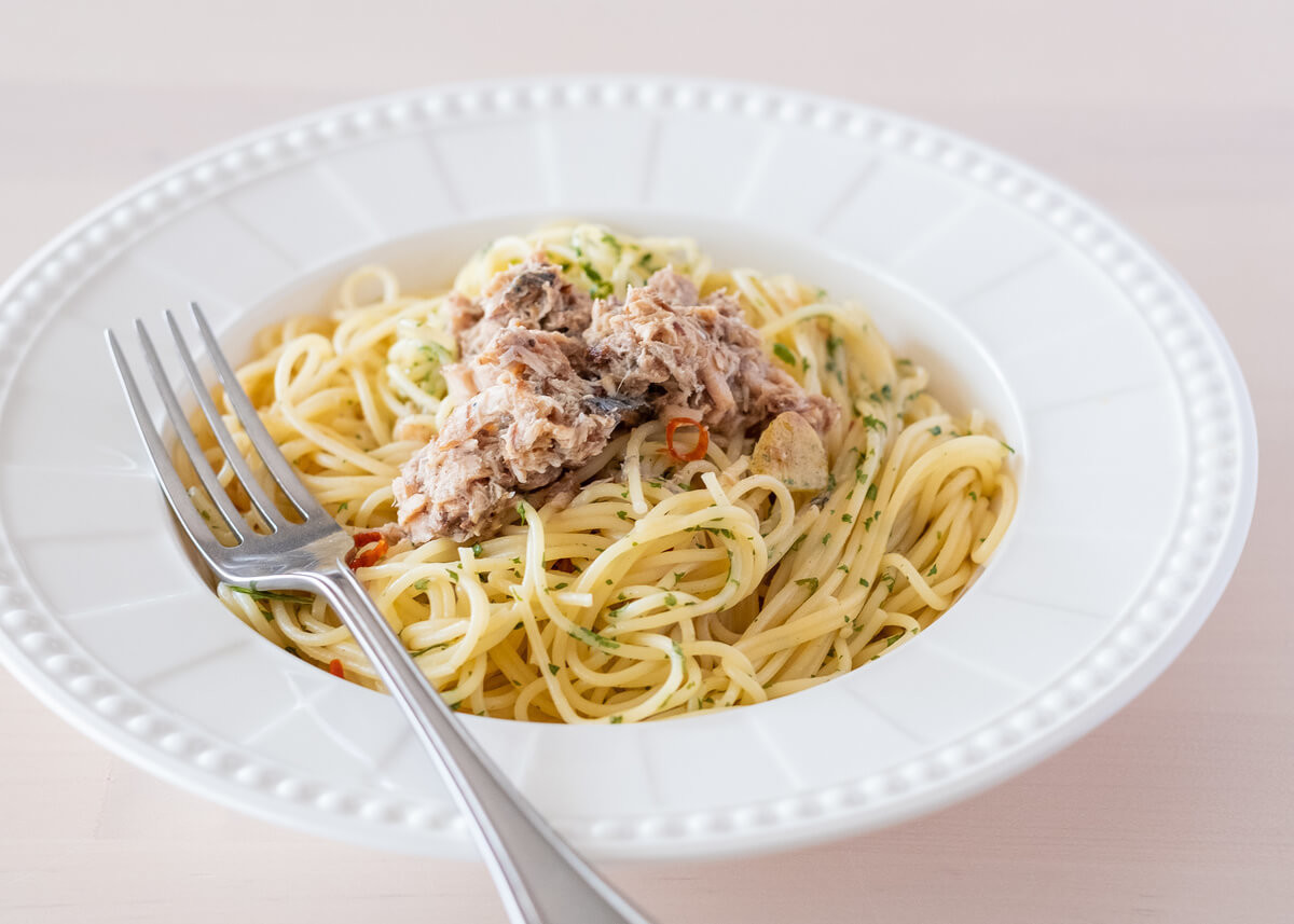 ニンニクとさばは相性抜群!セブンプレミアムの「オイルごと使えるオリーブオイルさば」 を加えることで、しっかり味のボリューミーなペペロンチーノに仕上げることができます。