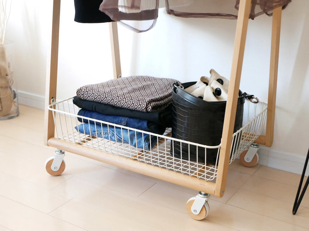コートなどの衣類も掛けられるほか、たくさん置けるワイドバスケット付きなので、バッグを床置きせず自然と整理整頓された空間になります。
