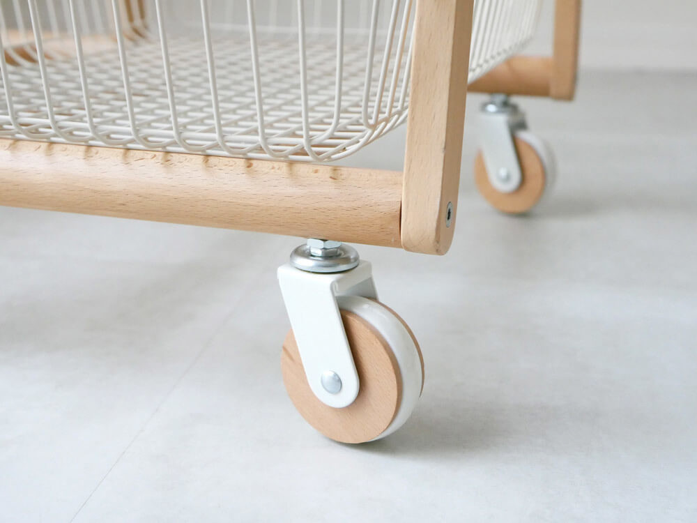 また、バスケットの使い勝手は思ったよりも◎で、ただの平台ではないから入れすぎてもこぼれ落ちることもなく、急いでいる時に適当に置いてもそれなりに見えるから助かります。 そして、初めて見た私が驚いたのがキャスターの滑り。なめらか~にすーっと動くので、無駄にコロコロ滑らせていました。