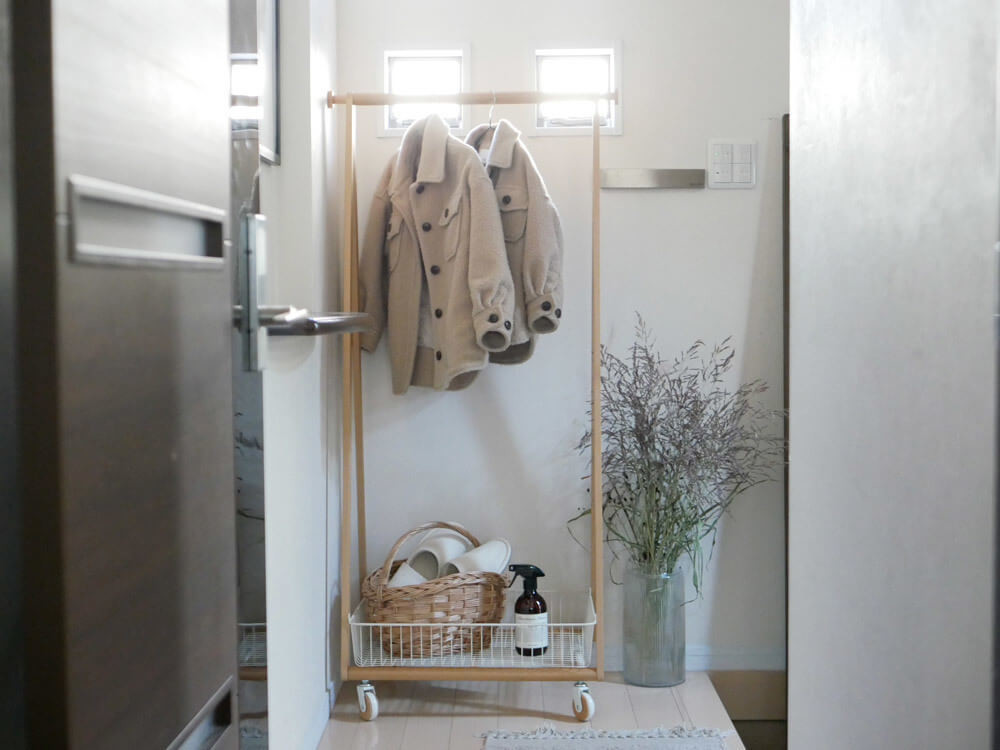 それに、天然木のビーチ素材で囲われたコートハンガーは、良い意味で主張しすぎず、お部屋の雰囲気を損なわないので、家族がくつろぐリビングにぴったりなんです。