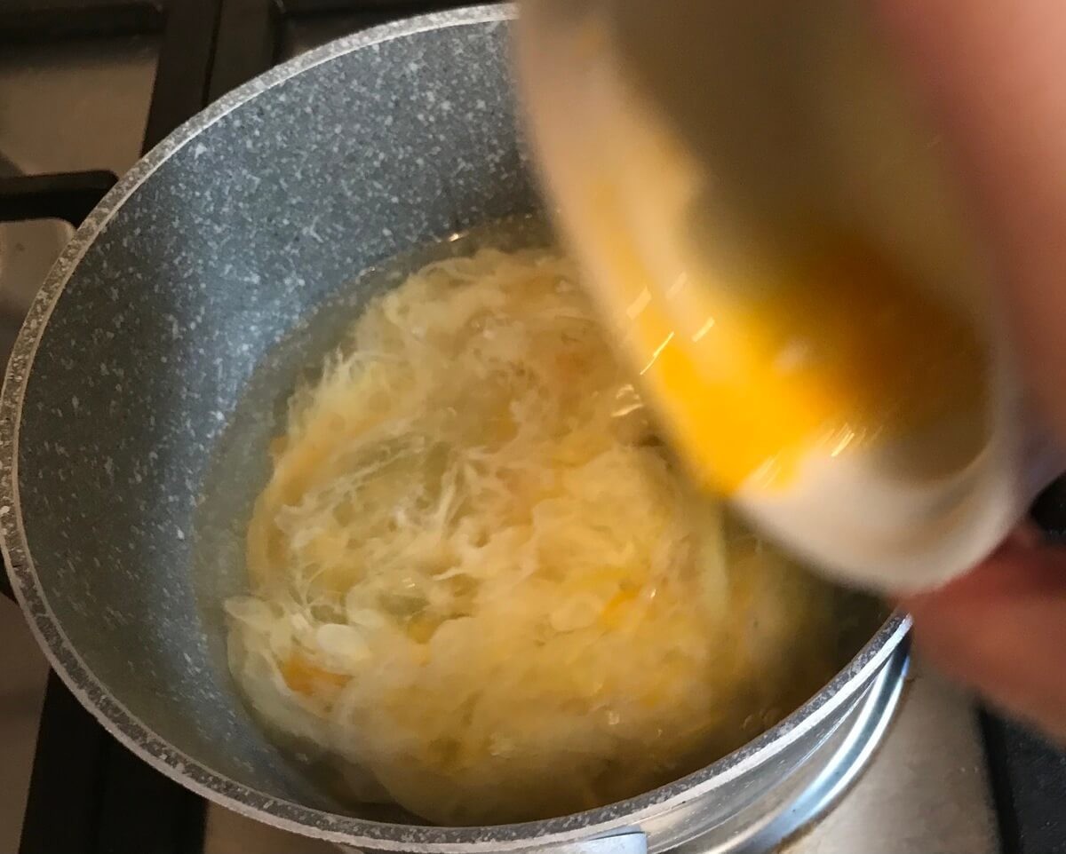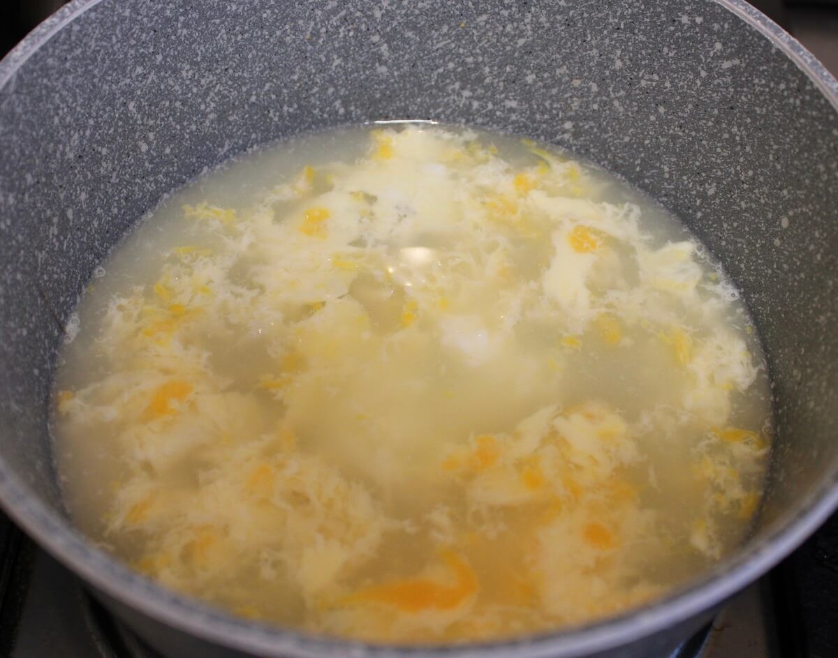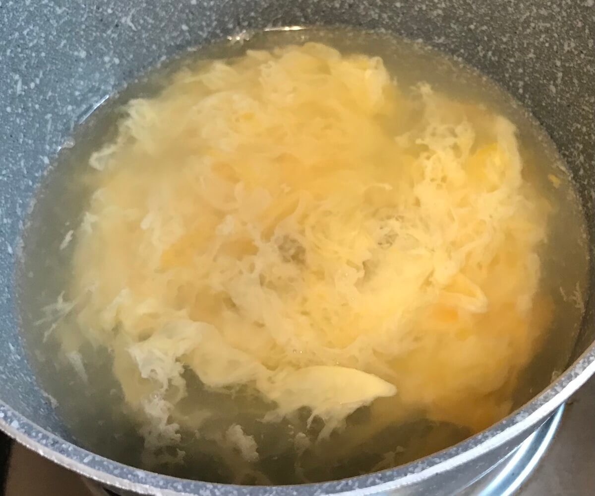 「卵スープ」レシピ③スープの水流と逆向きに回転させながら卵を入れる