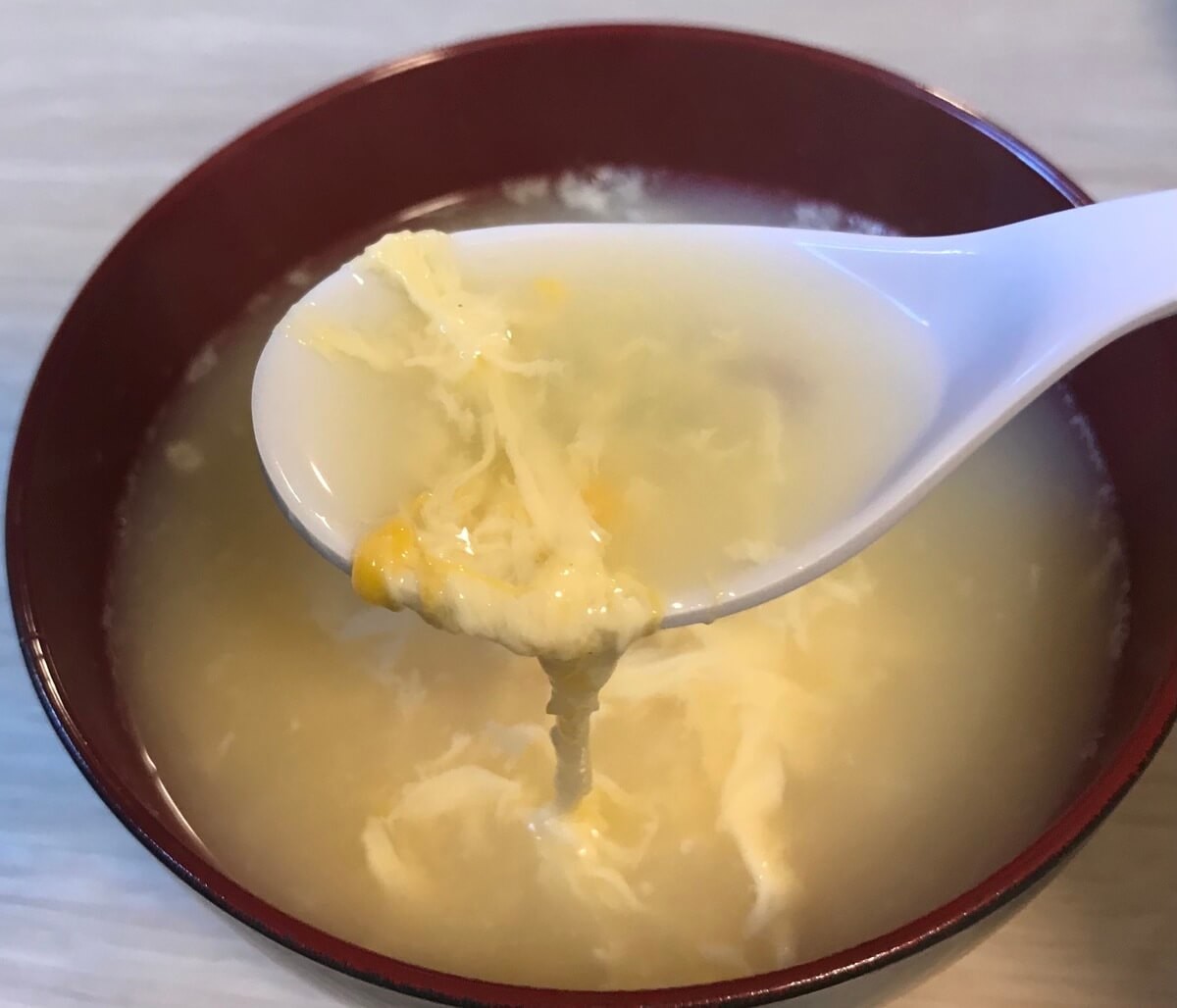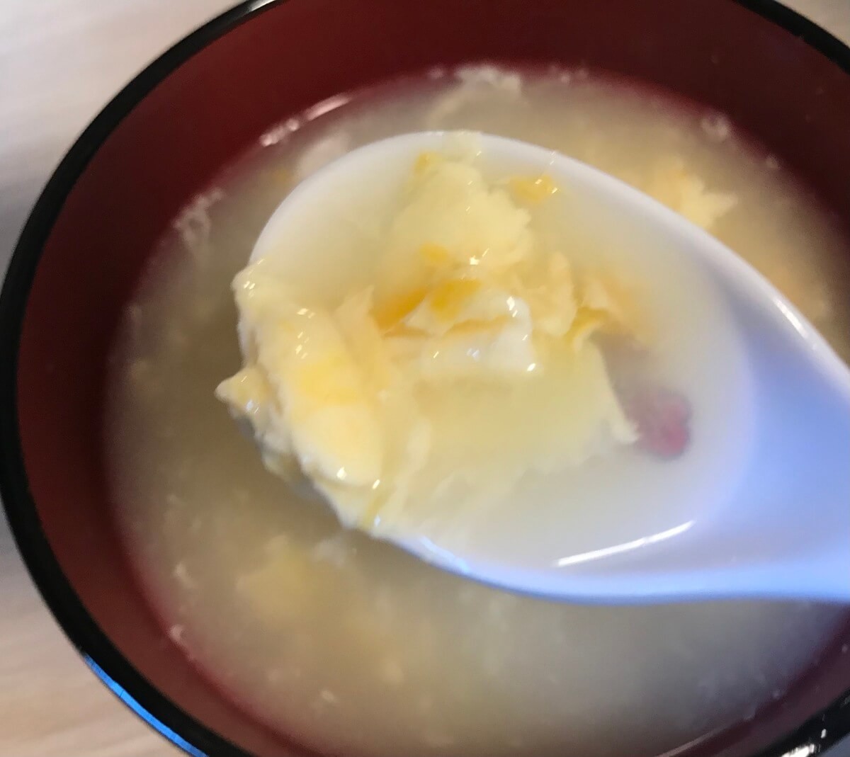 スプーンですくってみると、卵がふわふわしていません。卵のかたまりになり、食感も固くなってしまいました。また、スープも濁り気味になっているのに気付きました。