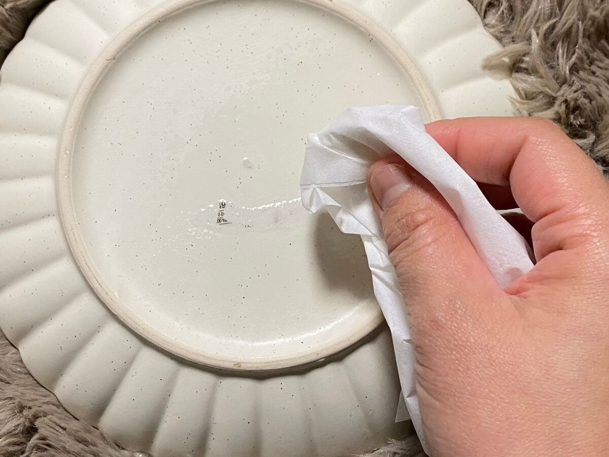 まずはこれ!新調したばかりのお皿の商品シール。これを剥がすのが本当に苦手で、今まではシール跡がついたままお皿を使っていたこともありました(笑)。