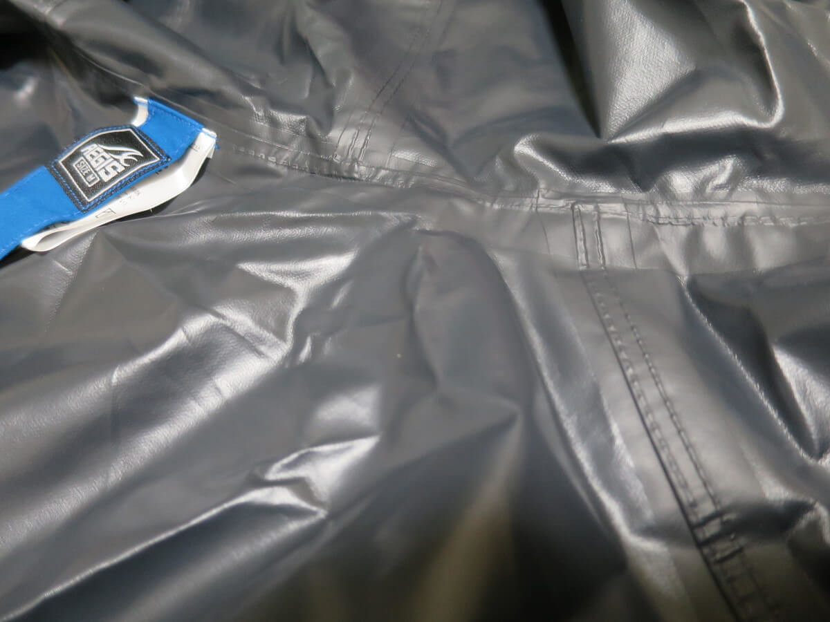 ちゃんと縫い目からの浸水も考えられており、生地の縫い合わせ部分にはシールテープ加工が施されています。 裾の縁はゴムでコーティングされており、まくれ上がらないような工夫もまさに自転車に最適なレインウェアと言えます。