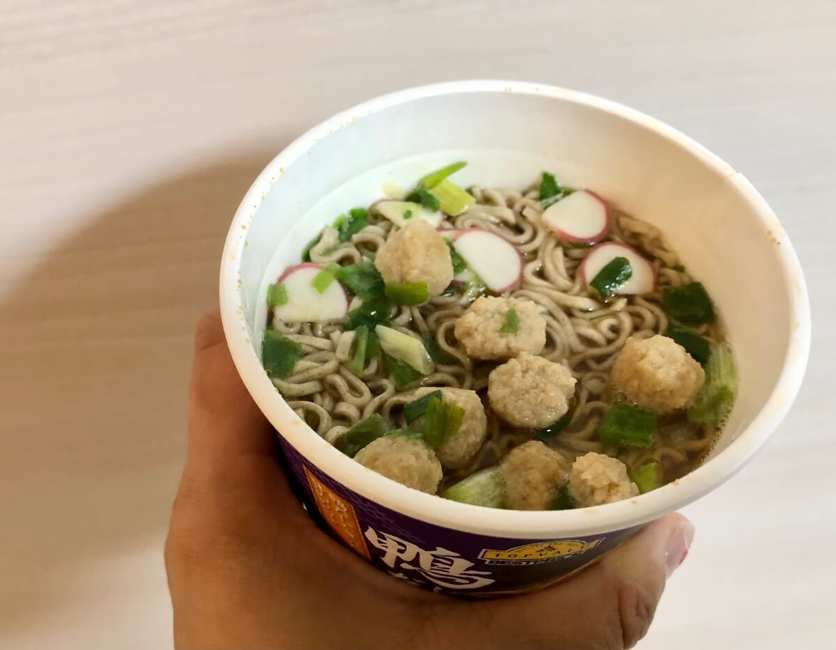 まさに私が年末に家族にだしたカップ蕎麦が、トップバリュの鴨だしそばでした。甘めのつゆに、まるで生姜が効いたような味の鶏団子の組み合わせ。このありそうでなかった蕎麦は、特に寒い夜に食べたくなる味です。
