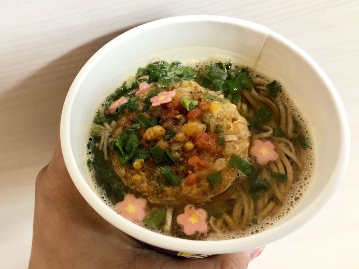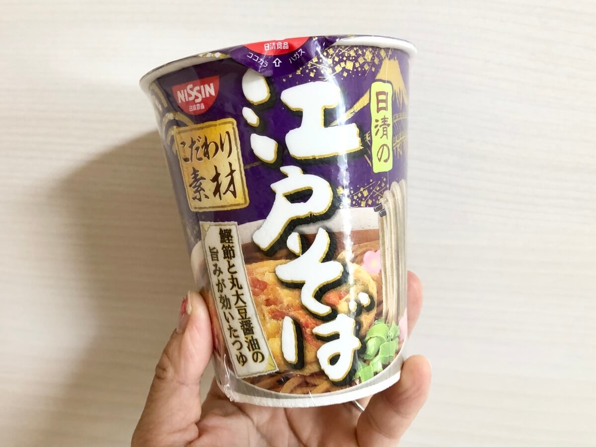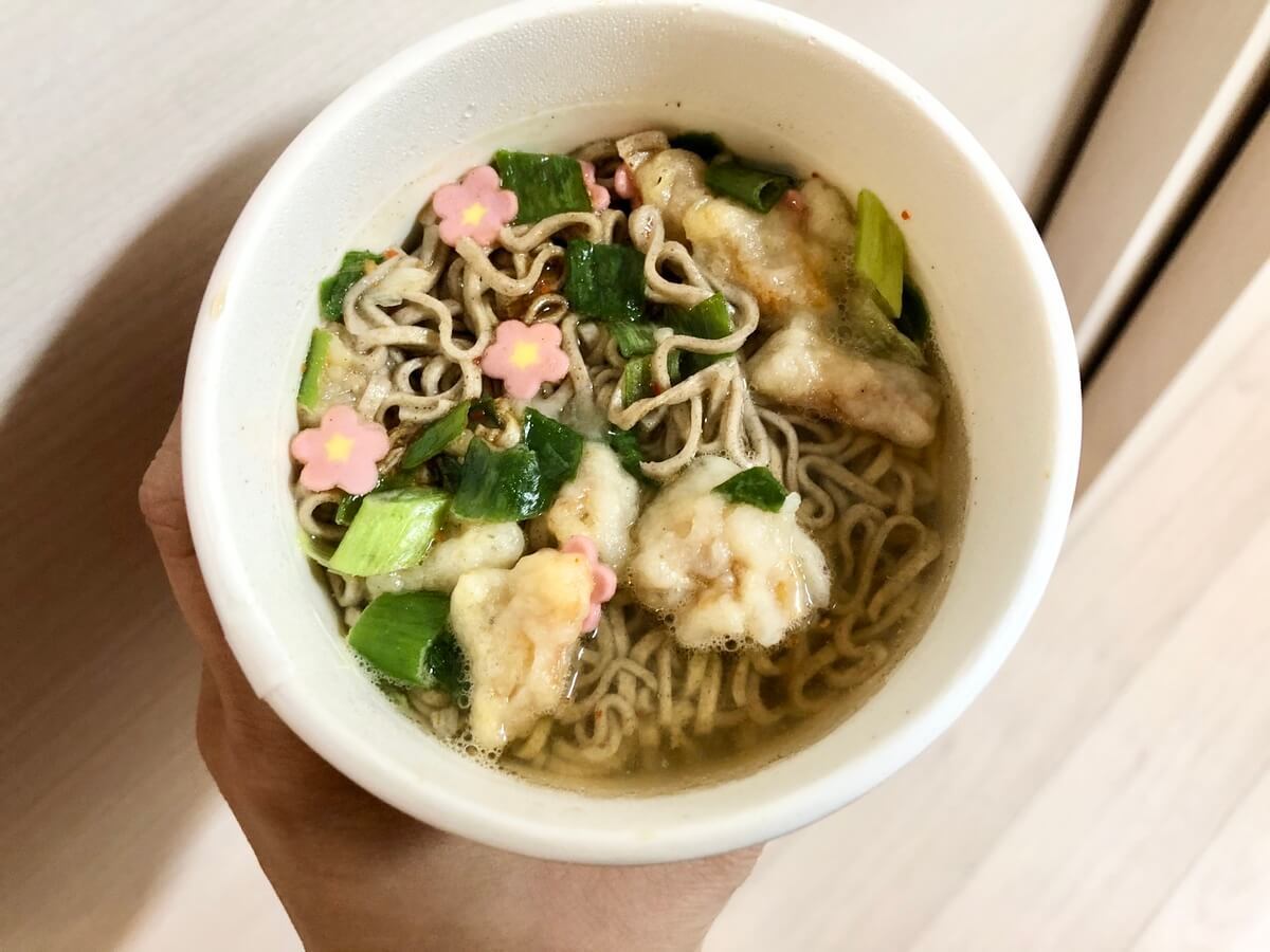 こちらは素材の産地やうまみにこだわって作った「日清のこだわり素材シリーズ」のカップ麺です。丸大豆醤油や焼津加工の鰹節が使われています。甘さが強めのつゆに、桜の麩も可愛いので、女性はきっと気に入るはず。