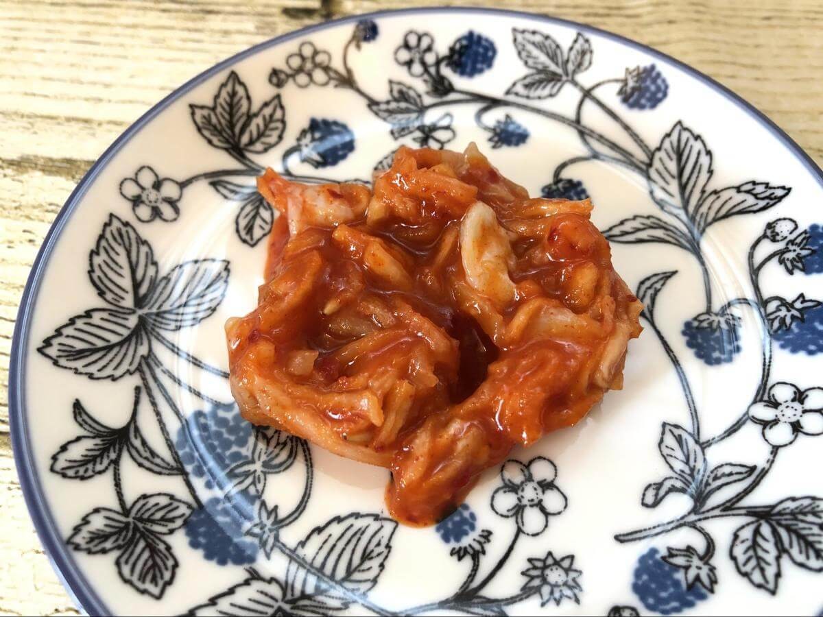 こちらもたこキムチと同じく、千切り大根が入っています。ただ、たこキムチには入っていないごま油が追加されている様子。