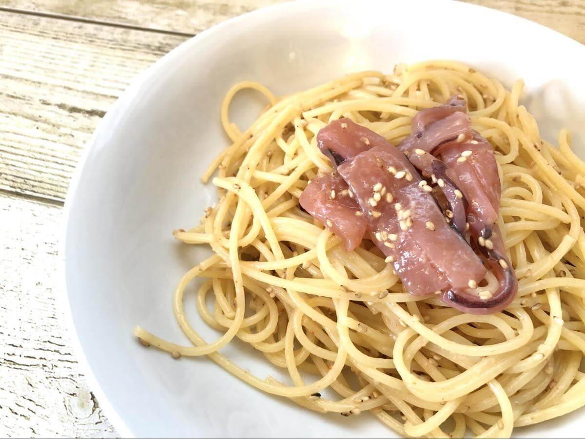 しょうゆとバターを茹でた麺に絡ませ、いか明太とごまをプラスすれば完成です。バターがいか明太のしょっぱさをマイルドにしてくれます。