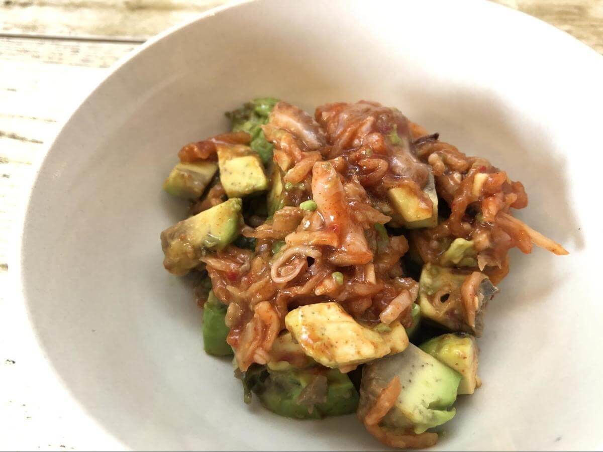 たこキムチとチャンジャは、アボカドと和えて女子向けおつまみに。ダイス状でカットしたアボカドに、たこキムチorチャンジャを混ぜて、めんつゆをプラス。