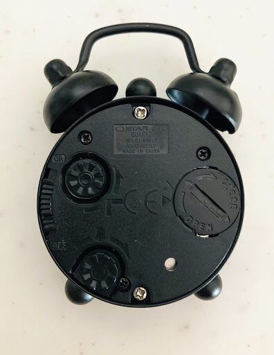 裏面には電池を入れる部分や時刻・アラームを調節するダイヤルが付いています。アラームのON・OFFもスイッチ一つで設定が可能です。箱の中には説明書が入っているので、説明書通りに設定していきます。