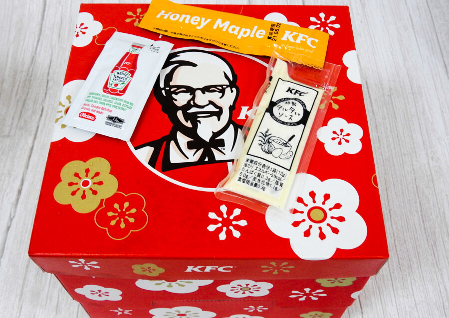なんとなくおせちっぽくみえるケンタッキー「ケンタお重(梅)」2100円(税込)。お重箱は紙製ですので、持ち帰りする時は崩さないように気を付けましょう。ケチャップやタルタルソース、メイプルシロップがついていました。