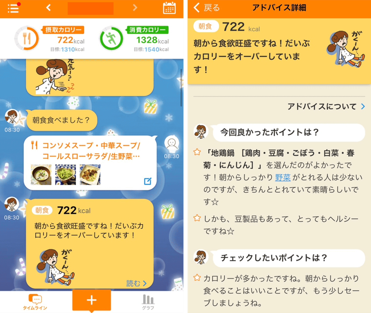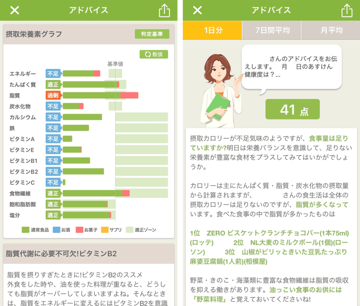 AI栄養士のキャラクターが、栄養状態に合わせたダイエットアドバイスをくれるので、改善点がわかりやすく、栄養や食の知識を習得できる点もメリット。