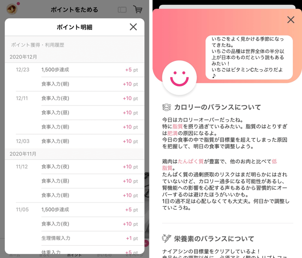カロリーだけでなく、ビタミンやミネラルなど、15種類の栄養素のバランスもチェックできるというのも嬉しいポイント。記録後は、AIのキャラクターから丁寧なアドバイスももらえます。