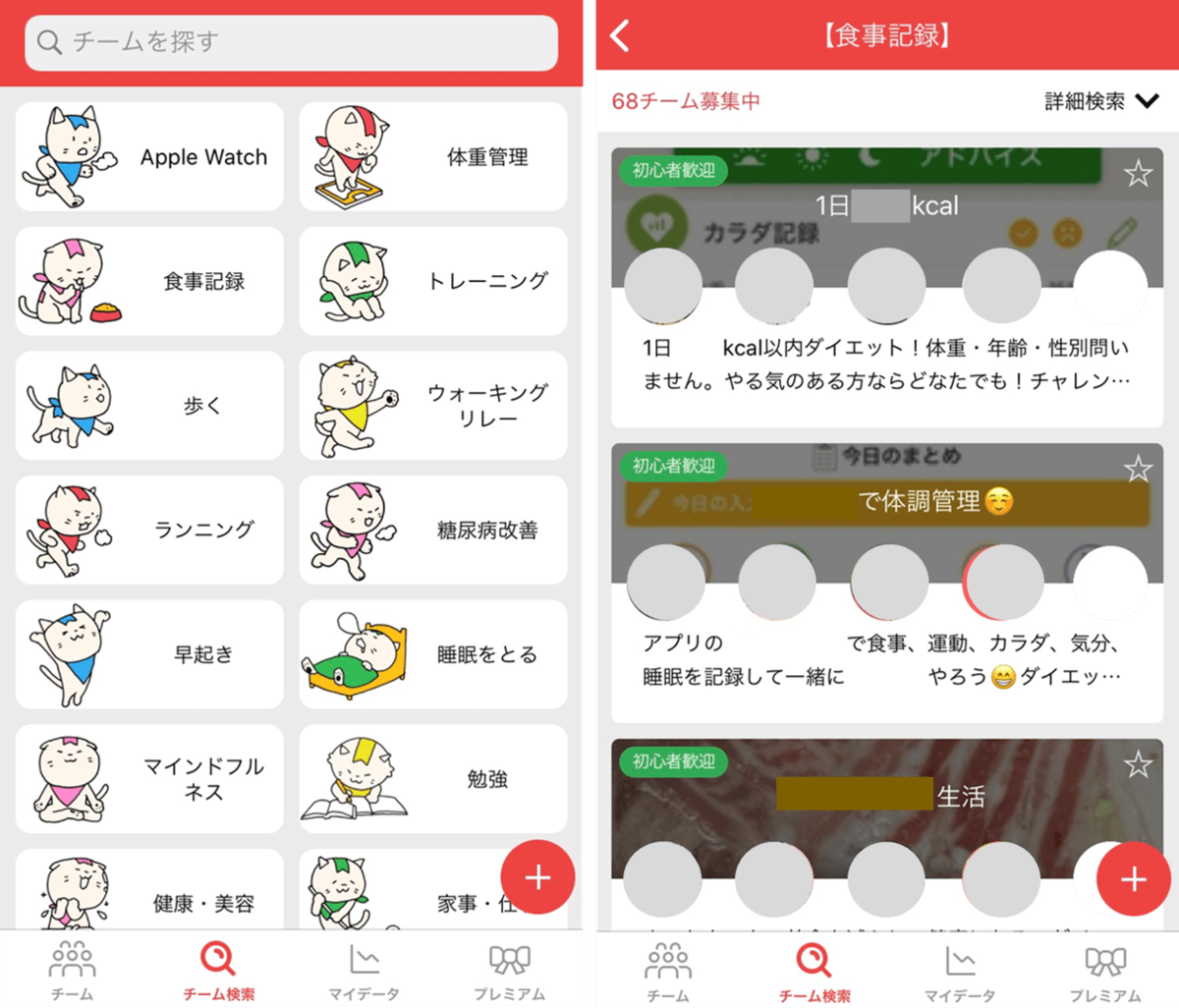体重記録や食事管理、運動などを習慣にしたい人が5人集まってチームを作り、チャットでお互いに励まし合うことができます。 自然と「チームの仲間が頑張っているから自分も頑張らなきゃ!」と思えるので、やる気が続き、目標を達成しやすいのが特徴です。匿名アカウントで参加できるため、実名がバレてしまうこともありません。