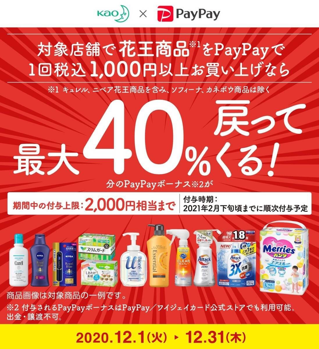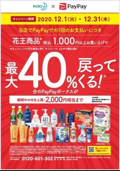 キャンペーン対象の花王商品を買うと、40%相当のPayPayボーナスポイントが付与されます。