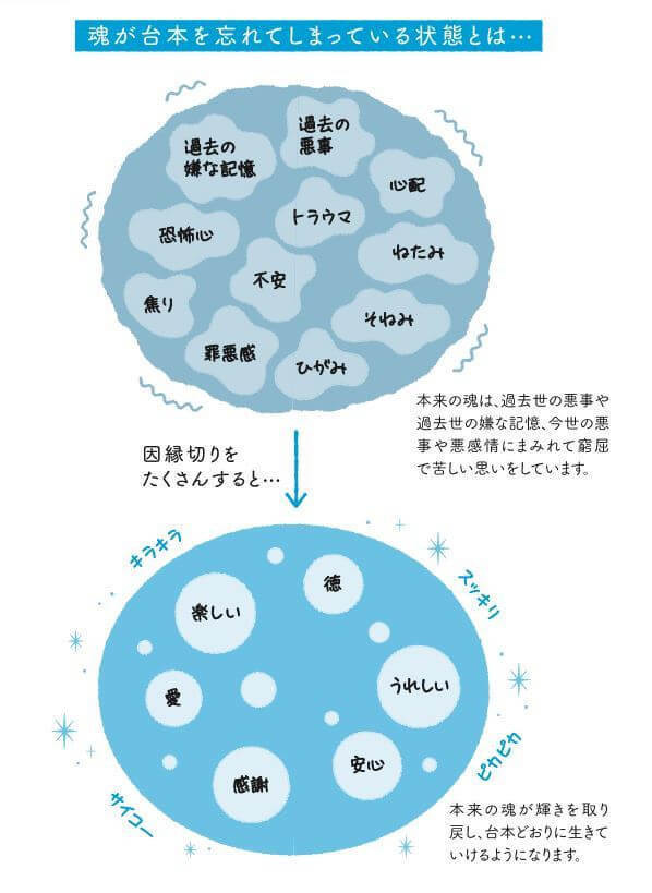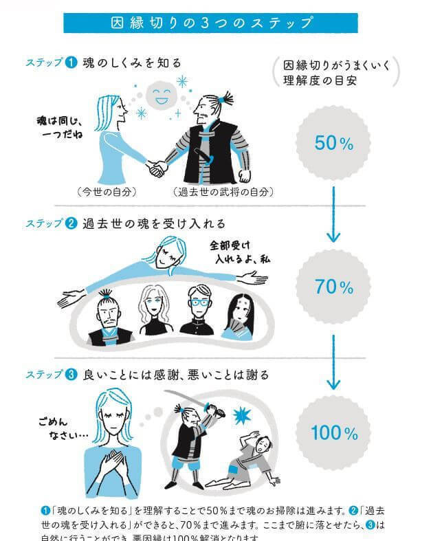 本著書では、人間関係を軸に最短で幸せになれる「因縁切りの3つのステップ」を紹介。(1)魂のしくみを知る、にはじまり、(2)過去世の魂を受け入れる、(3)良いことには、感謝、悪いことは謝る――と各章に分け、魂のお掃除=“因縁切り”の方法をわかりやすく解説しています。