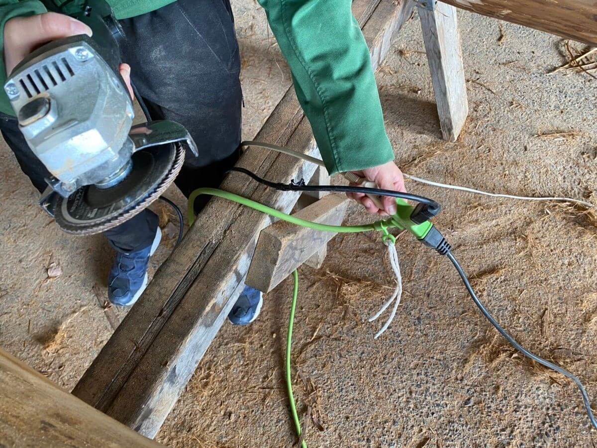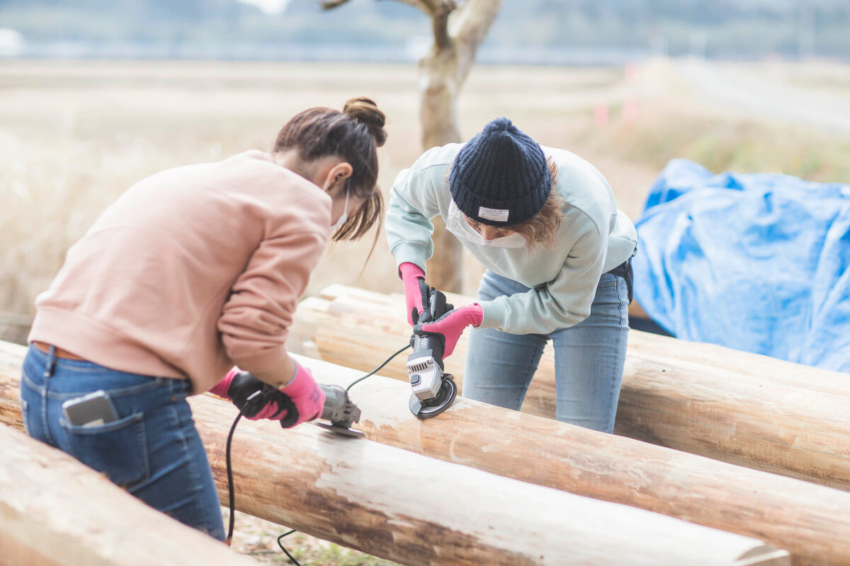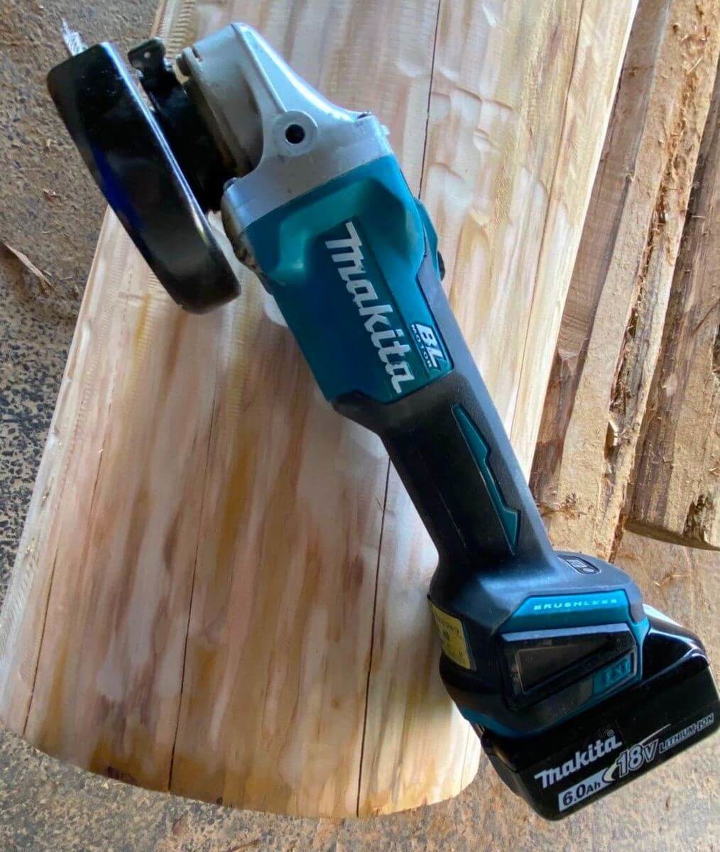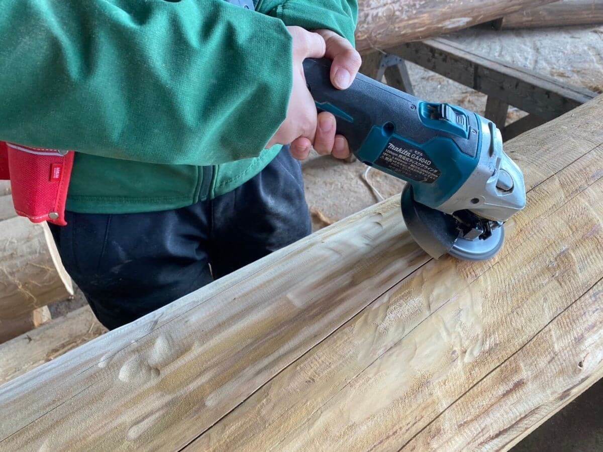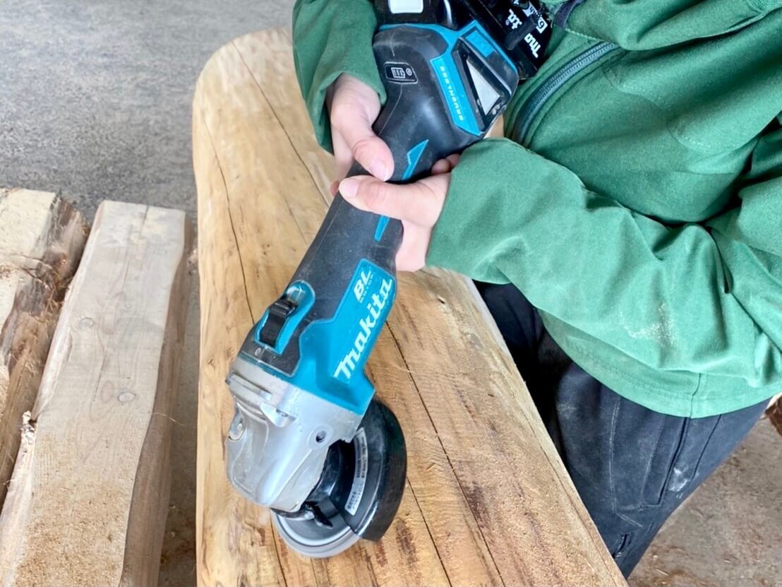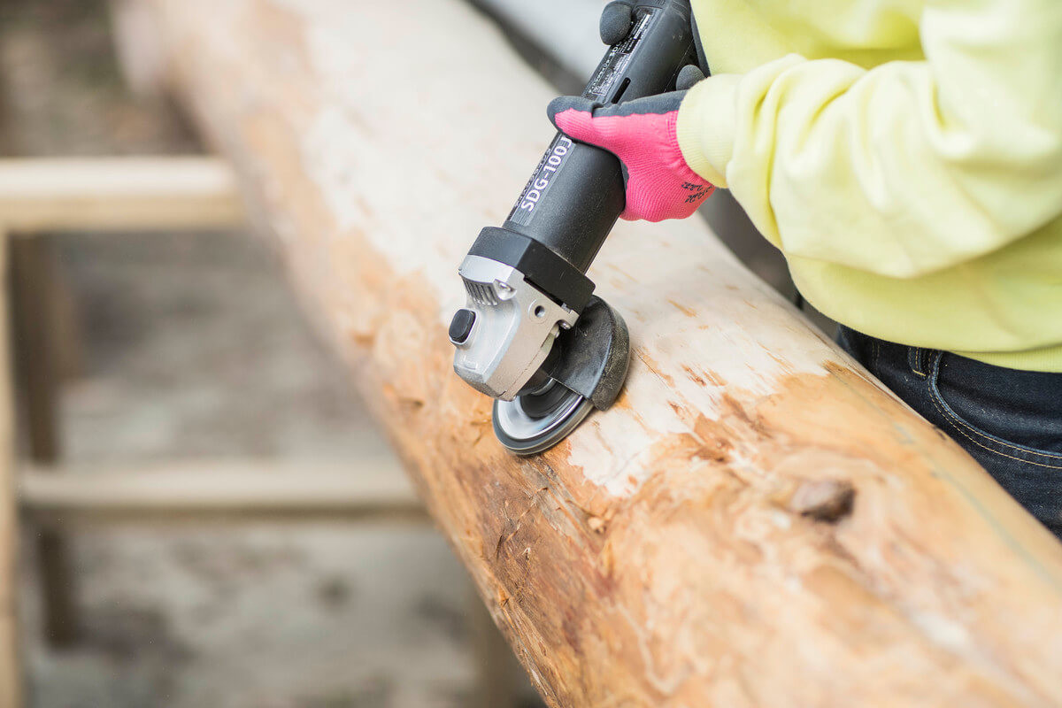 今回の作業では、丸太の表面・角などをなめらかに磨く際に使っています。