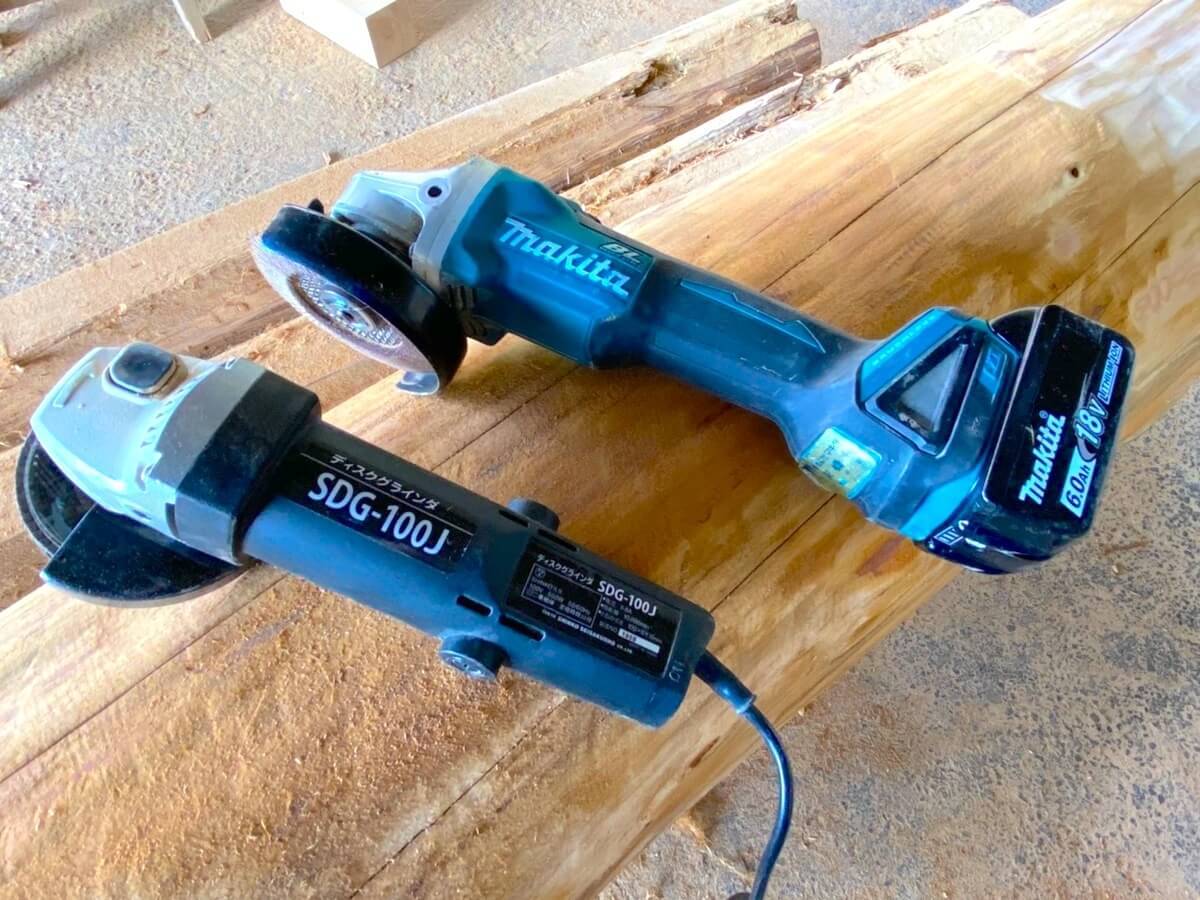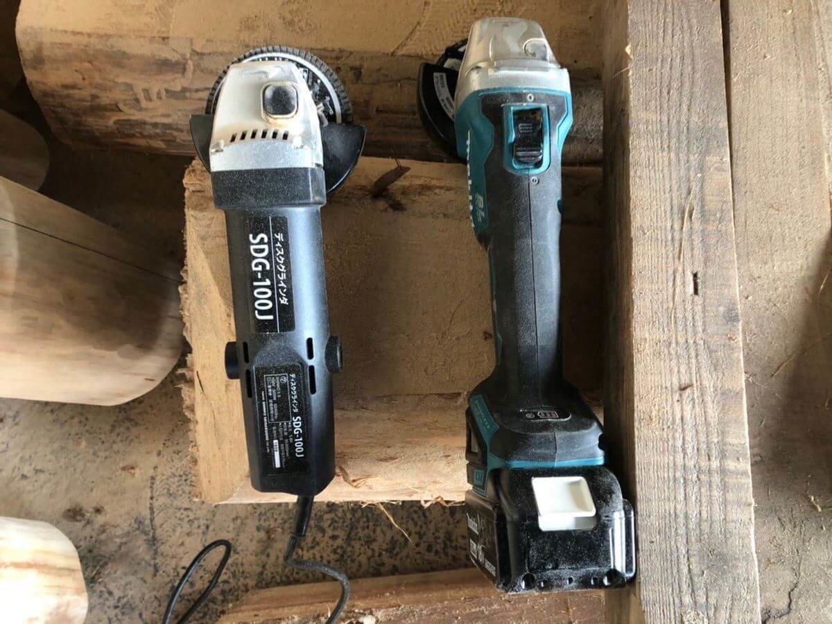 すると、作業場の足元はコードだらけになり、結構危険!「コードがグラインダのディスクに接触したら危ない!」という心配も多かったのですが、コードレスになったことで、コードを気にすることは無くなりました。