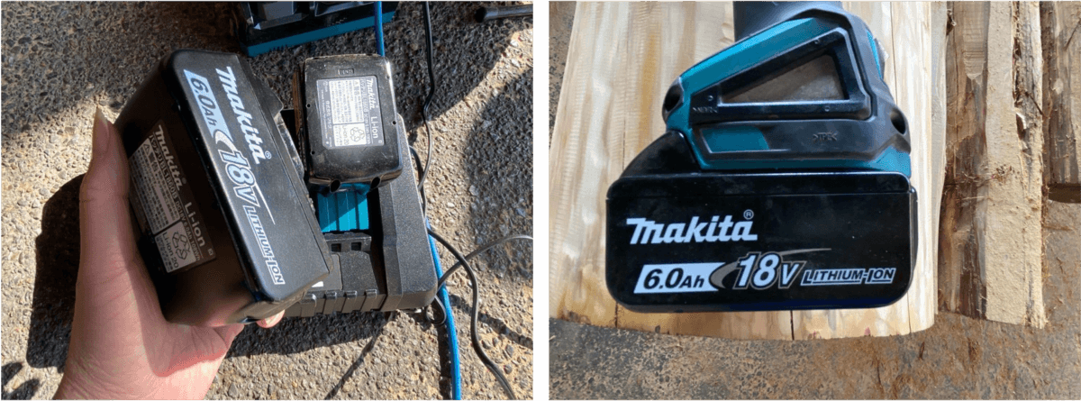 18Vのバッテリー(容量6.0Ah)を使ったところ、連続装用時間は約30分!さらに他のマキタ製品とバッテリーが同じなので、バッテリーの使いまわしも可能です。