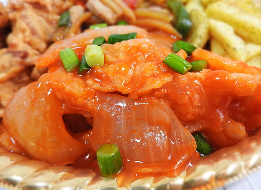 エビと玉ねぎ、青ねぎが入っているエビチリ。食べてみましたが、まったくピリ辛ではありません。5歳の息子も食べていましたが「辛い」という声もなし。辛いのが苦手な人でも食べられそうです。エビチリというよりは、ケチャップ和えみたいですね。味は可もなく不可もなしといったところでした。