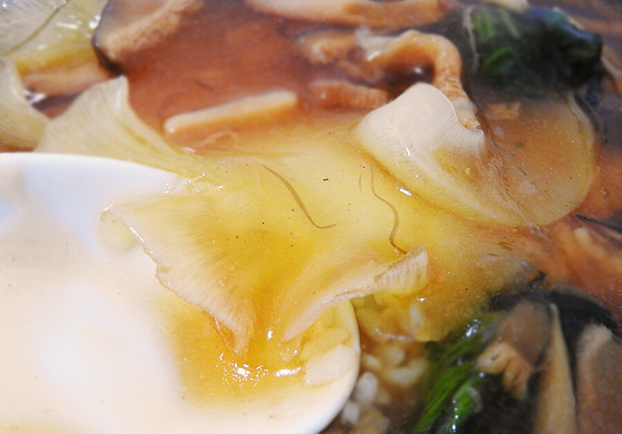 店頭から受け取ってから、実食までに約20分……。フカヒレの劣化が心配でしたが、特にしなびた様子はありません。あんかけをかける前に一口いただきましたが、コリコリとした歯ごたえでしたね。