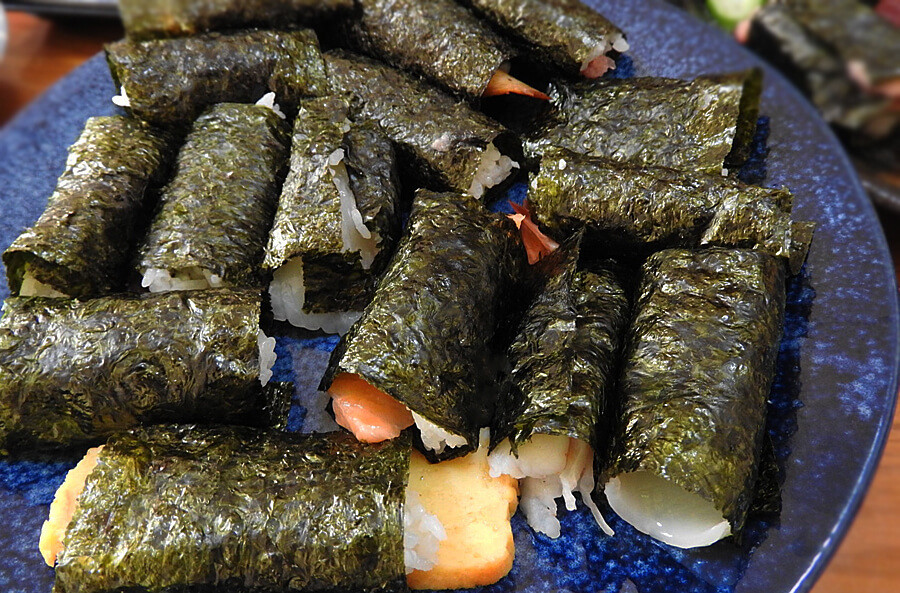 ▲不格好な手巻き寿司たち。実際には写真の手巻き寿司の他に、大皿1枚分の手巻き寿司ができあがりました。